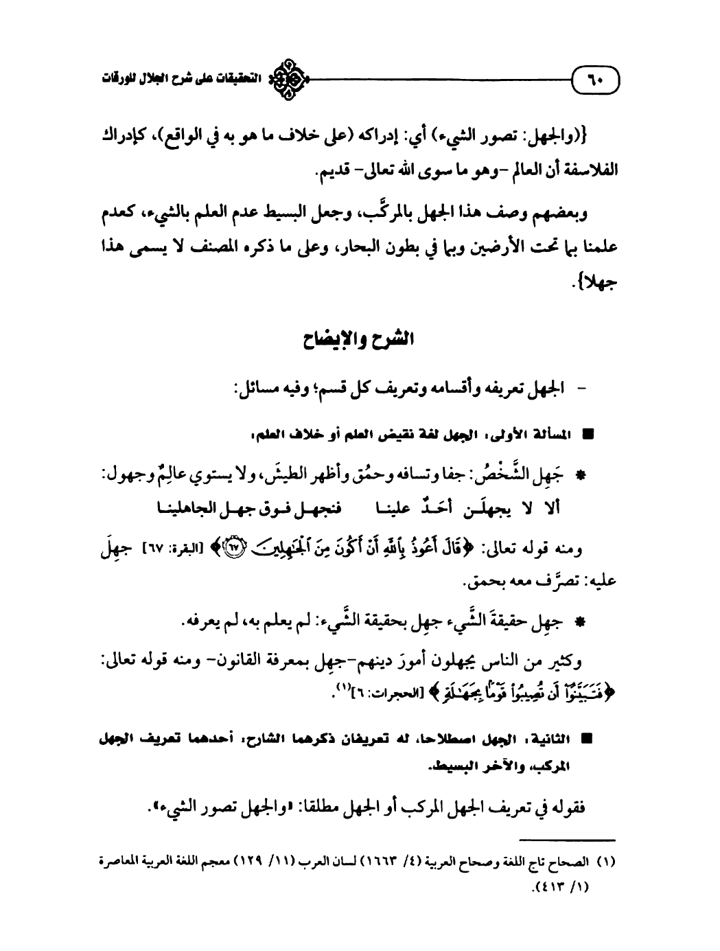 الثانية: الجهل اصطلاحا، له تعريفان ذكرهما الشارح: أحدهما تعريف الجهل المركب، والآخر البسيط.