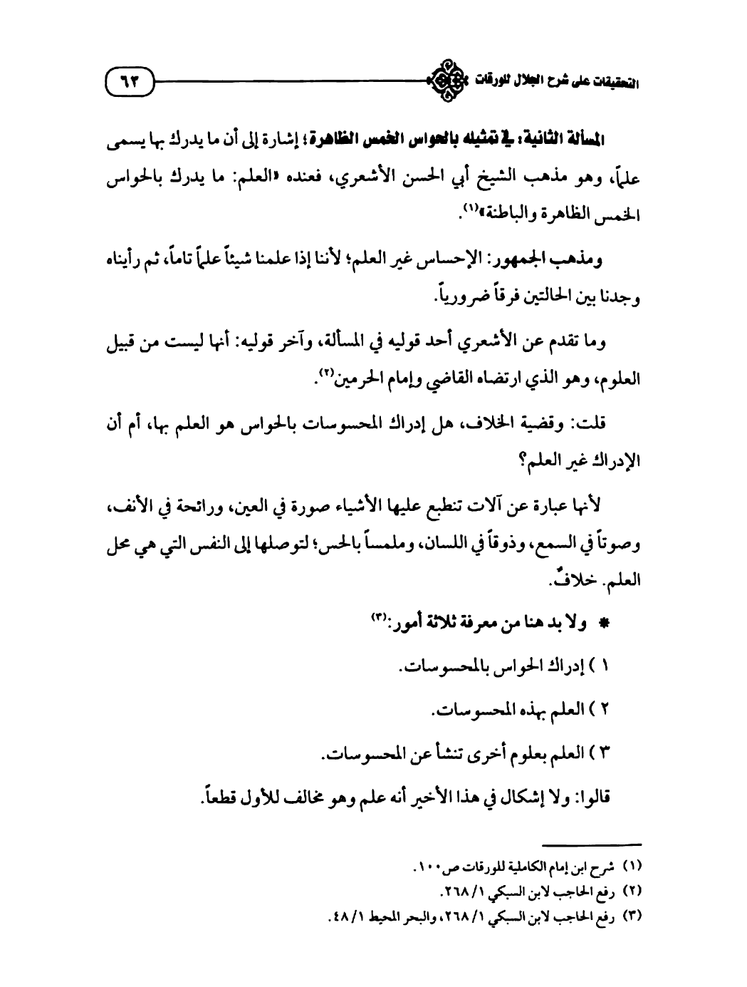 قلت: وقضية الخلاف، هل إدراك المحسوسات بالحواس هو العلم بها، أم أن الإدراك غير العلم؟