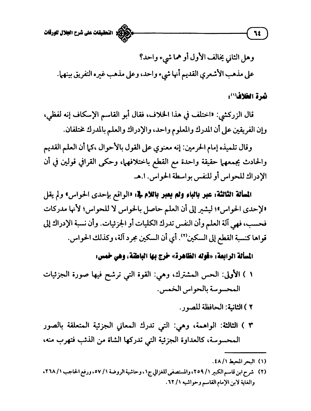 وقال تلميذه إمام الحرمين: إنه معنوي على القول بالأحوال، كما أن العلم القديم والحادث يجمعهما حقيقة واحدة مع القطع باختلافهما، وحكى القرافي قولين في أن الإدراك للحواس أو للنفس بواسطة الحواس. ا. هـ