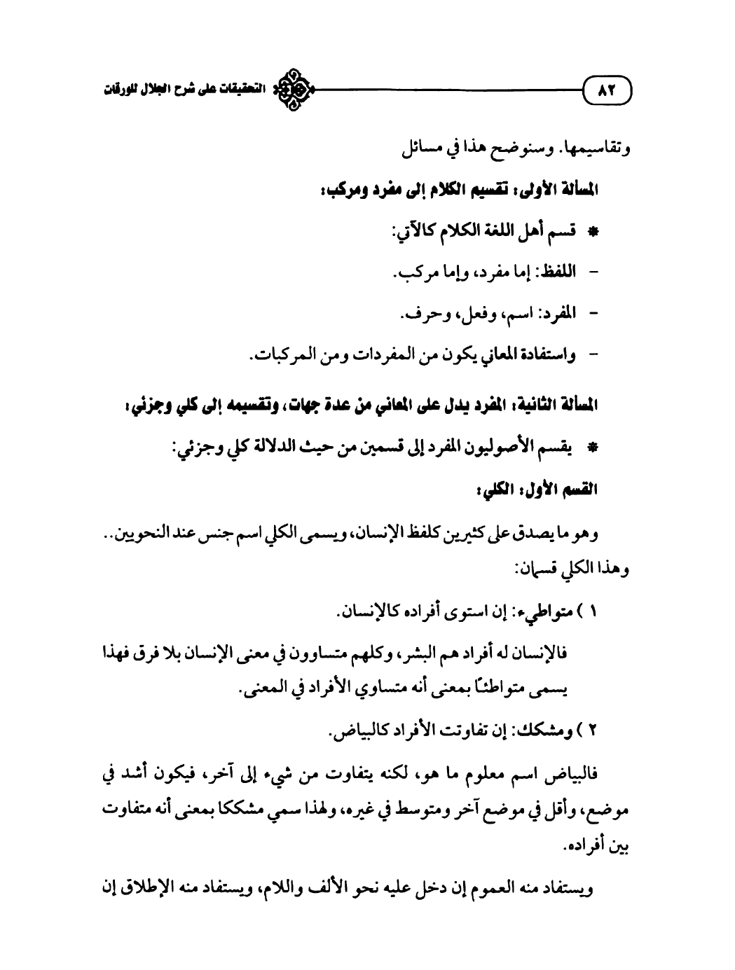 المسألة الثانية: المفرد يدل على المعاني من عدة جهات، وتقسيمه إلى كلي وجزئي
