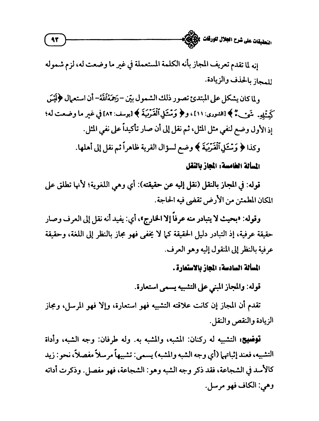 ولما كان يشكل على المبتدئ تصور ذلك الشمول بيّن -رحمه الله- أن استعمال {ليَسَ كَمِثْلِهِ شيئ} [الشورى: ١١]، و {وَاسألِ القَرْيَةَ} [يوسف: ٨٢] في غير ما وضعت له؛ إذ الأول وضع لنفي مثل المثل، ثم نقل إلى أن صار تأكيداً على نفي المثل.