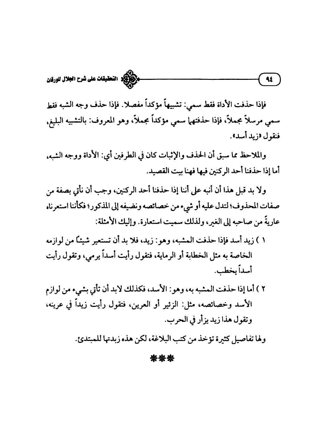 فإذا حذفت الأداة فقط سمي: تشبيهاً مؤكداً مفصلا. فإذا حذف وجه الشبه فقط سمي مرسلاً مجملاً، فإذا حذفتهما سمي مؤكداً مجملاً، وهو المعروف: بالتشبيه البليغ، فنقول "زيد أسد".