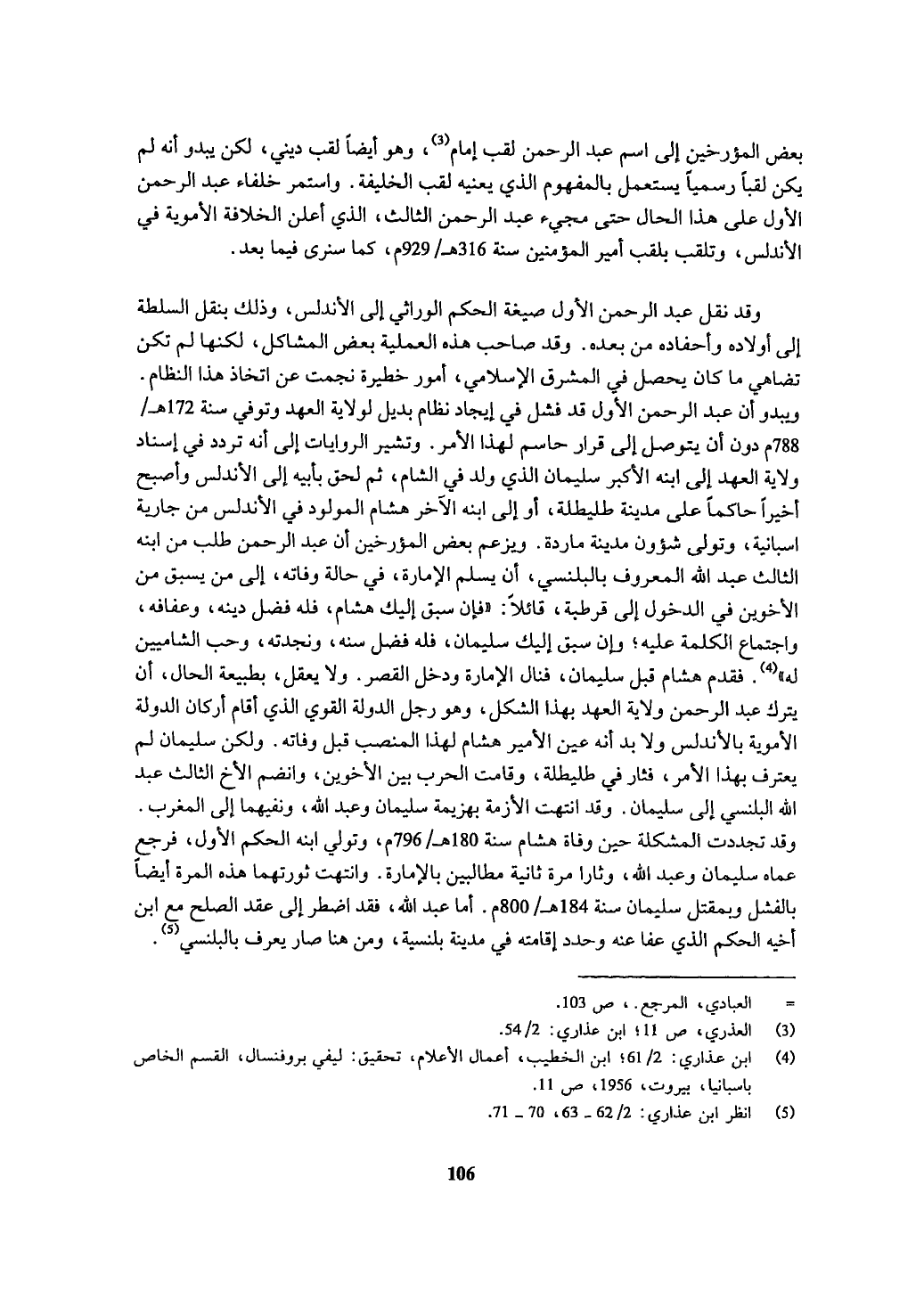بعض المؤرخين إلى اسم عبد الرحمن لقب إمام (¬3)، وهو أيضاً لقب ديني، لكن يبدو أنه لم يكن لقباً رسمياً يستعمل بالمفهوم الذي يعنيه لقب الخليفة. واستمر خلفاء عبد الرحمن الأول على هذا الحال حتى مجيء عبد الرحمن الثالث، الذي أعلن الخلافة الأموية في الأندلس، وتلقب بلقب أمير المؤمنين سنة 316 هـ/929 م، كما سنرى فيما بعد.