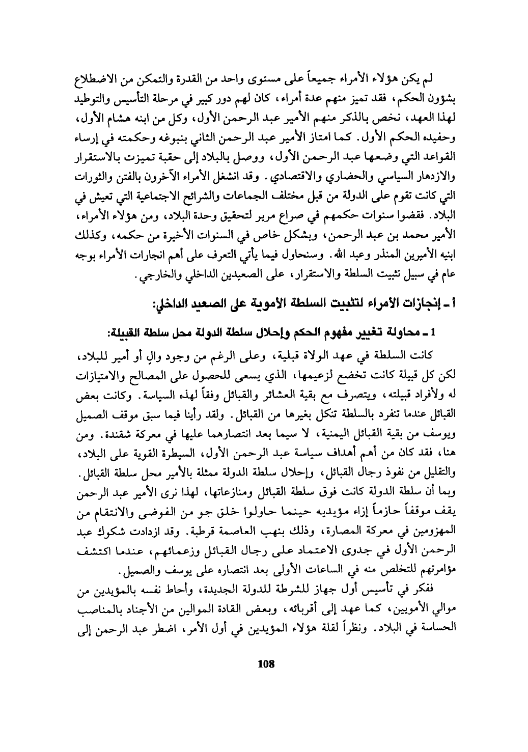 لم يكن هؤلاء الأمراء جميعاً على مستوى واحد من القدرة والتمكن من الاضطلاع بشؤون الحكم، فقد تميز منهم عدة أمراء، كان لهم دور كبير في مرحلة التأسيس والتوطيد لهذا العهد، نخص بالذكر منهم الأمير عبد الرحمن الأول، وكل من ابنه هشام الأول، وحفيده الحكم الأول. كما امتاز الأمير عبد الرحمن الثاني بنبوغه وحكمته في إرساء القواعد التي وضعها عبد الرحمن الأول، ووصل بالبلاد إلى حقبة تميزت بالاستقرار والازدهار السياسي والحضاري والاقتصادي. وقد انشغل الأمراء الآخرون بالفتن والثورات التي كانت تقوم على الدولة من قبل مختلف الجماعات والشرائح الاجتماعية التي تعيش في البلاد. فقضوا سنوات حكمهم في صراع مرير لتحقيق وحدة البلاد، ومن هؤلاء الأمراء، الأمير محمد بن عبد الرحمن، وبشكل خاص في السنوات الأخيرة من حكمه، وكذلك ابنيه الأميرين المنذر وعبد الله. وسنحاول فيما يأتي التعرف على أهم إنجازات الأمراء بوجه عام في سبيل تثبيت السلطة والاستقرار، على الصعيدين الداخلي والخارجي.