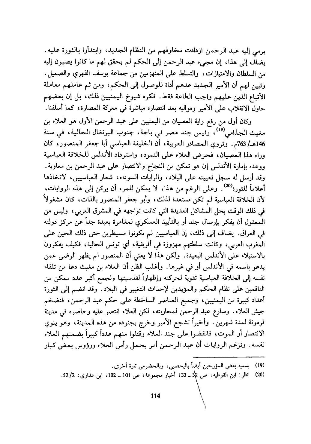 وكان أول من رفع راية العصيان من اليمنيين على عبد الرحمن الأول هو العلاء بن مغيث الجذامي (¬19)، رئيس جند مصر في باجة، جنوب البرتغال الحالية، في سنة 146 هـ/763 م. وتروي المصادر العربية، أن الخليفة العباسي أبا جعفر المنصور، كان وراء هذا العصيان، فحرض العلاء على التمرد، واسترداد الأندلس للخلافة العباسية ووعده بإمارة الأندلس إن هو تمكن من النجاح والانتصار على عبد الرحمن بن معاوية. وقد أرسل له سجل تعيينه على البلاد، والرايات السوداء، شعار العباسيين، لاتخاذها أعلاماً للثورة (¬20). وعلى الرغم من هذا، لا يمكن للمرء أن يركن إلى هذه الروايات، لأن الخلافة العباسية لم تكن مستعدة لذلك، وأبو جعفر المنصور بالذات، كان مشغولاً في ذلك الوقت بحل المشاكل العديدة التي كانت تواجهه في المشرق العربي، وليس من المعقول أن يفكر بإرسال جند أو بالتأييد العسكري لمغامرة بعيدة جداً عن مركز دولته في العراق. يضاف إلى ذلك، أن العباسيين لم يكونوا مسيطرين حتى ذلك الحين على المغرب العربي، وكانت سلطتهم مهزوزة في أفريقية، أي تونس الحالية، فكيف يفكرون بالاستيلاء على الأندلس البعيدة. ولكن هذا لا يعني أن المنصور لم يظهر الرضى عمن يدعو باسمه في الأندلس أو في غيرها. وأغلب الظن أن العلاء بن مغيث دعا من تلقاء نفسه إلى الخلافة العباسية تقوية لحركته وإظهاراً لقدسيتها ولجمع أكبر عدد ممكن من الناقمين على نظام الحكم والمؤيدين لإحداث التغيير في البلاد. وقد انضم إلى الثورة أعداد كبيرة من اليمنيين، وجميع العناصر الساخطة على حكم عبد الرحمن، فتضخم جيش العلاء. وسارع عبد الرحمن لمحاربته، لكن العلاء انتصر عليه وحاصره في مدينة قرمونة لمدة شهرين. وأخيراً تشجع الأمير وخرج بجنوده من هذه المدينة، وهو ينوي الانتصار أو الموت، فانقضوا على جند العلاء وقتلوا منهم عدداً كبيراً بضمنهم العلاء نفسه. وتزعم الروايات أن عبد الرحمن أمر بحمل رأس العلاء ورؤوس بعض كبار