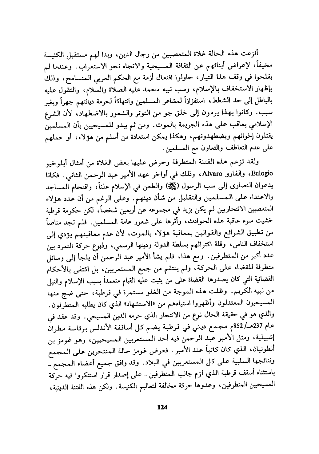 أفزعت هذه الحالة غلاة المتعصبين من رجال الدين، وبدا لهم مستقبل الكنيسة مخيفاً، لإعراض أبنائهم عن الثقافة المسيحية والاتجاه نحو الاستعراب. وعندما لم يفلحوا في وقف هذا التيار، حاولوا افتعال أزمة مع الحكم العربي المتسامح، وذلك بإظهار الاستخفاف بالإسلام، وسب نبيه محمد عليه الصلاة والسلام، والتقول عليه بالباطل إلى حد الشطط، استفزازاً لمشاعر المسلمين وانتهاكاً لحرمة ديانتهم جهراً وبغير سبب. وكانوا بهذا يرمون إلى خلق جو من التوتر والشعور بالاضطهاد، لأن الشرع الإسلامي يعاقب على هذه الجريمة بالموت. ومن ثم يبدو للمسيحيين بأن المسلمين يقتلون إخوانهم ويضطهدونهم، وهكذا يمكن استعادة من أسلم من هؤلاء، أو حملهم على عدم التعاطف والتعاون مع المسلمين.