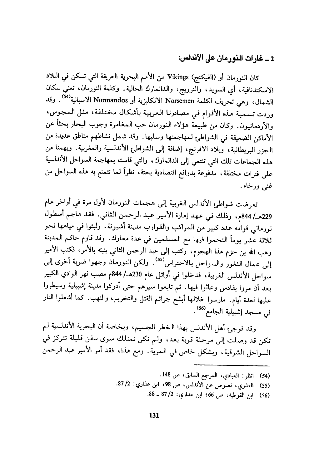 كان النورمان أو (الفيكنج) Vikings من الأمم البحرية العريقة التي تسكن في البلاد الاسكندنافية، أي السويد، والنرويج، والدانمارك الحالية. وكلمة النورمان، تعني سكان الشمال، وهي تحريف لكلمة Norsemen الانكليزية أو Normandos الاسبانية (¬54). وقد وردت تسمية هذه الأقوام في مصادرنا العربية بأشكال مختلفة، مثل المجوس، والأردمانيون. وكان من طبيعة هؤلاء النورمان حب المغامرة وجوب البحار بحثاً عن الأماكن الضعيفة في الشواطئ لمهاجمتها وسلبها. وقد شمل نشاطهم مناطق عديدة من الجزر البريطانية، وبلاد الإفرنج، إضافة إلى الشواطئ الأندلسية والمغربية. ويهمنا من هذه الجماعات تلك التي تنتمي إلى الدانمارك، والتي قامت بمهاجمة السواحل الأندلسية على فترات مختلفة، مدفوعة بدوافع اقتصادية بحتة، نظراً لما تتمتع به هذه السواحل من غنى ورخاء.