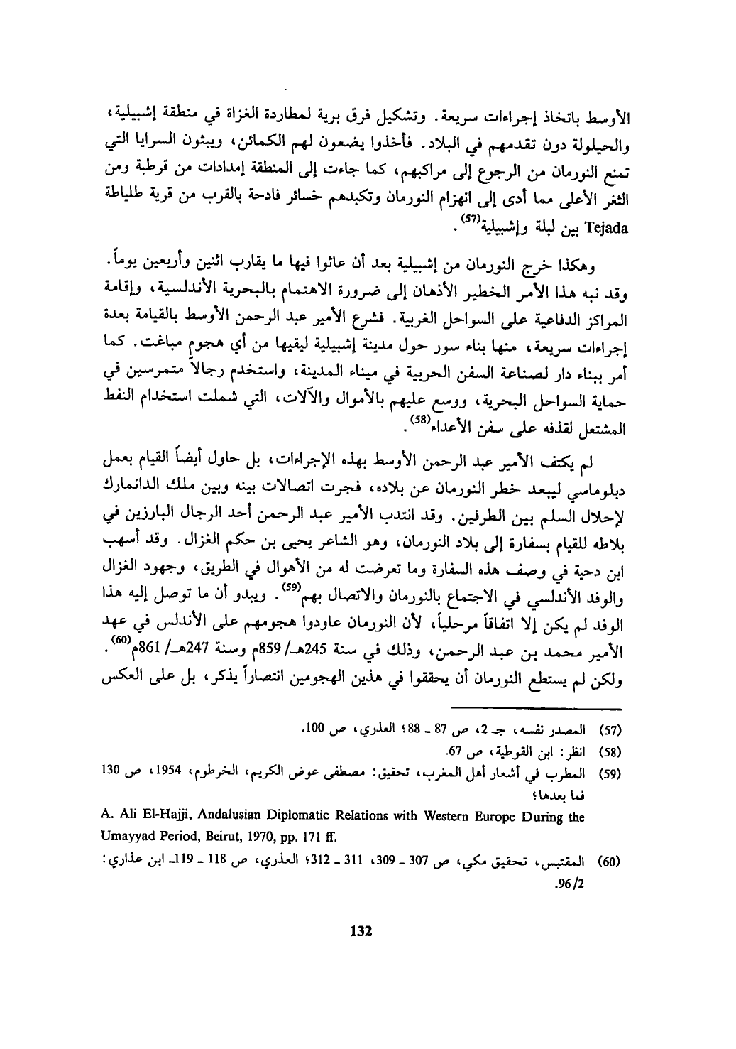 لم يكتف الأمير عبد الرحمن الأوسط بهذه الإجراءات، بل حاول أيضاً القيام بعمل دبلوماسي ليبعد خطر النورمان عن بلاده، فجرت اتصالات بينه وبين ملك الدانمارك لإحلال السلم بين الطرفين. وقد انتدب الأمير عبد الرحمن أحد الرجال البارزين في بلاطه للقيام بسفارة إلى بلاد النورمان، وهو الشاعر يحيى بن حكم الغزال. وقد أسهب ابن دحية في وصف هذه السفارة وما تعرضت له من الأهوال في الطريق، وجهود الغزال والوفد الأندلسي في الاجتماع بالنورمان والاتصال بهم (¬59). ويبدو أن ما توصل إليه هذا الوفد لم يكن إلا اتفاقاً مرحلياً، لأن النورمان عاودوا هجومهم على الأندلس في عهد الأمير محمد بن عبد الرحمن، وذلك في سنة 245 هـ/859 م وسنة 247 هـ/861 م (¬60).