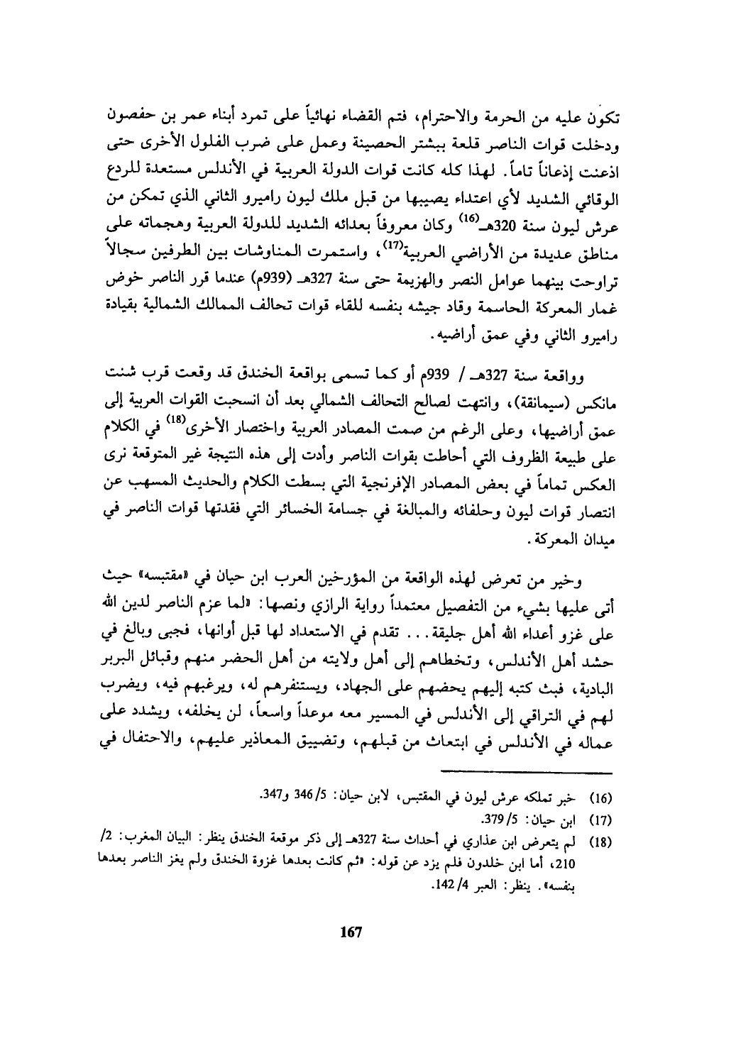 (¬18) لم يتعرض ابن عذاري في أحداث سنة 327 هـ إلى ذكر موقعة الخندق ينظر: البيان المغرب: 2/ 210، أما ابن خلدون فلم يزد عن قوله: " ثم كانت بعدها غزوة الخندق ولم يغز الناصر بعدها بنفسه ". ينظر: العبر 4/ 142.