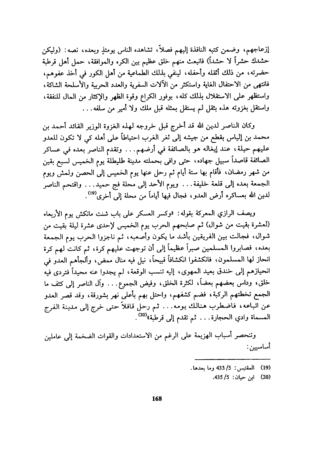 إزعاجهم، وضمن كتبه النافذة إليهم فصلاً، تشاهده الناس يومئذٍ وبعده، نصه: (وليكن حشدك حشراً لا حشداً) فانبعث منهم خلق عظيم بين الكره والموافقة، حمل أهل قرطبة حضرته، من ذلك أثقله وأحفله، لينفي بذلك الطماعية من أهل الكور في أخذ عفوهم، فانتهى من الاحتفال الغاية واستكثر من الآلات السفرية والعدد الحربية والأسلحة الشاكة، واستظهر على الاستقلال بذلك كله، بوفور الكراع وقوة الظهر والإكثار من المال للنفقة، واستقل بغزوته هذه بثقل لم يستقل بمثله قبل ملك ولا أمير من سلفه ...