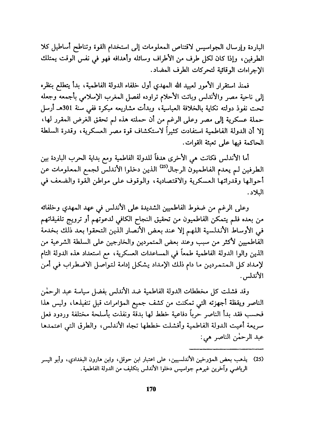(¬25) يذهب بعض المؤرخين الأندلسيين، على اعتبار ابن حوقل، وابن هارون البغدادي، وأبو اليسر الرياضي وآخرين غيرهم جواسيس دخلوا الأندلس بتكليف من الدولة الفاطمية.