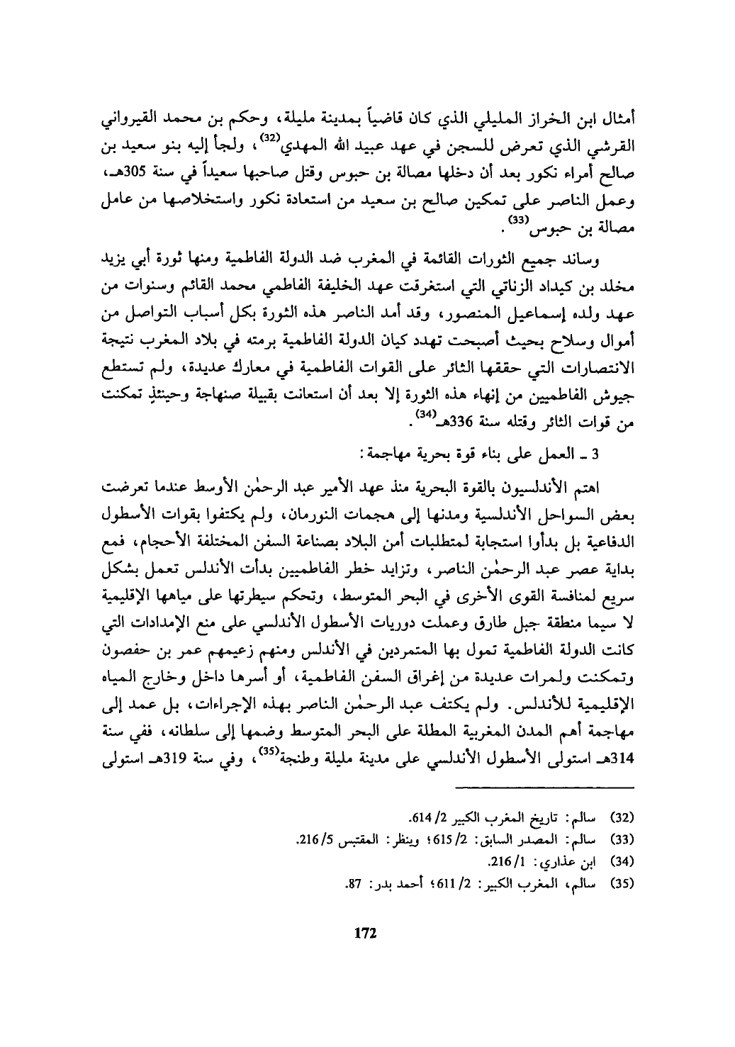 أمثال ابن الخراز المليلي الذي كان قاضياً بمدينة مليلة، وحكم بن محمد القيرواني القرشي الذي تعرض للسجن في عهد عبيد الله المهدي (¬32)، ولجأ إليه بنو سعيد بن صالح أمراء نكور بعد أن دخلها مصالة بن حبوس وقتل صاحبها سعيداً في سنة 305 هـ، وعمل الناصر على تمكين صالح بن سعيد من استعادة نكور واستخلاصها من عامل مصالة بن حبوس (¬33).