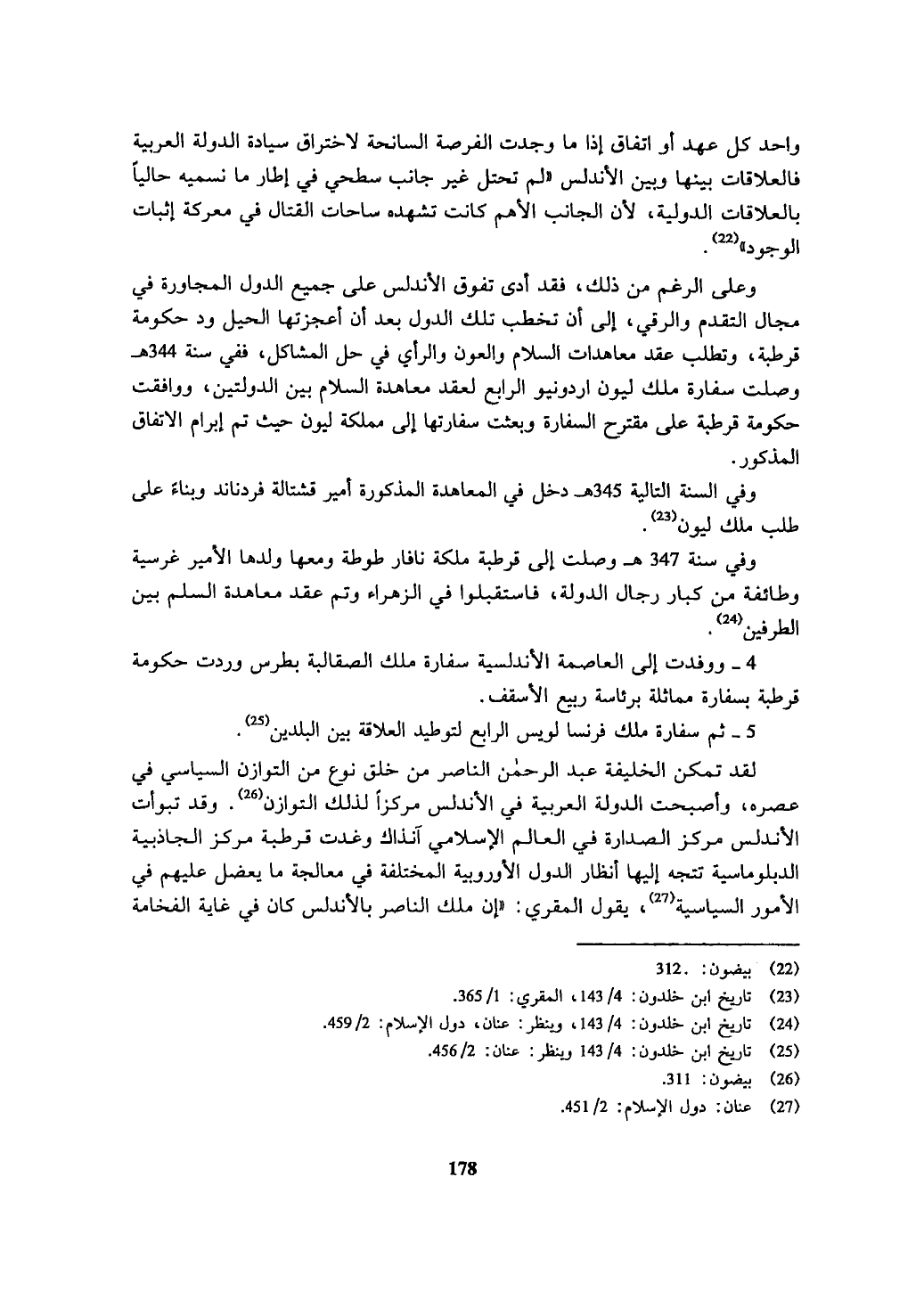 وعلى الرغم من ذلك، فقد أدى تفوق الأندلس على جميع الدول المجاورة في مجال التقدم والرقي، إلى أن تخطب تلك الدول بعد أن أعجزتها الحيل ود حكومة قرطبة، وتطلب عقد معاهدات السلام والعون والرأي في حل المشاكل، ففي سنة 344هـ وصلت سفارة ملك ليون اردونيو الرابع لعقد معاهدة السلام بين الدولتين، ووافقت حكومة قرطبة على مقترح السفارة وبعثت سفارتها إلى مملكة ليون حيث تم إبرام الاتفاق المذكور.
