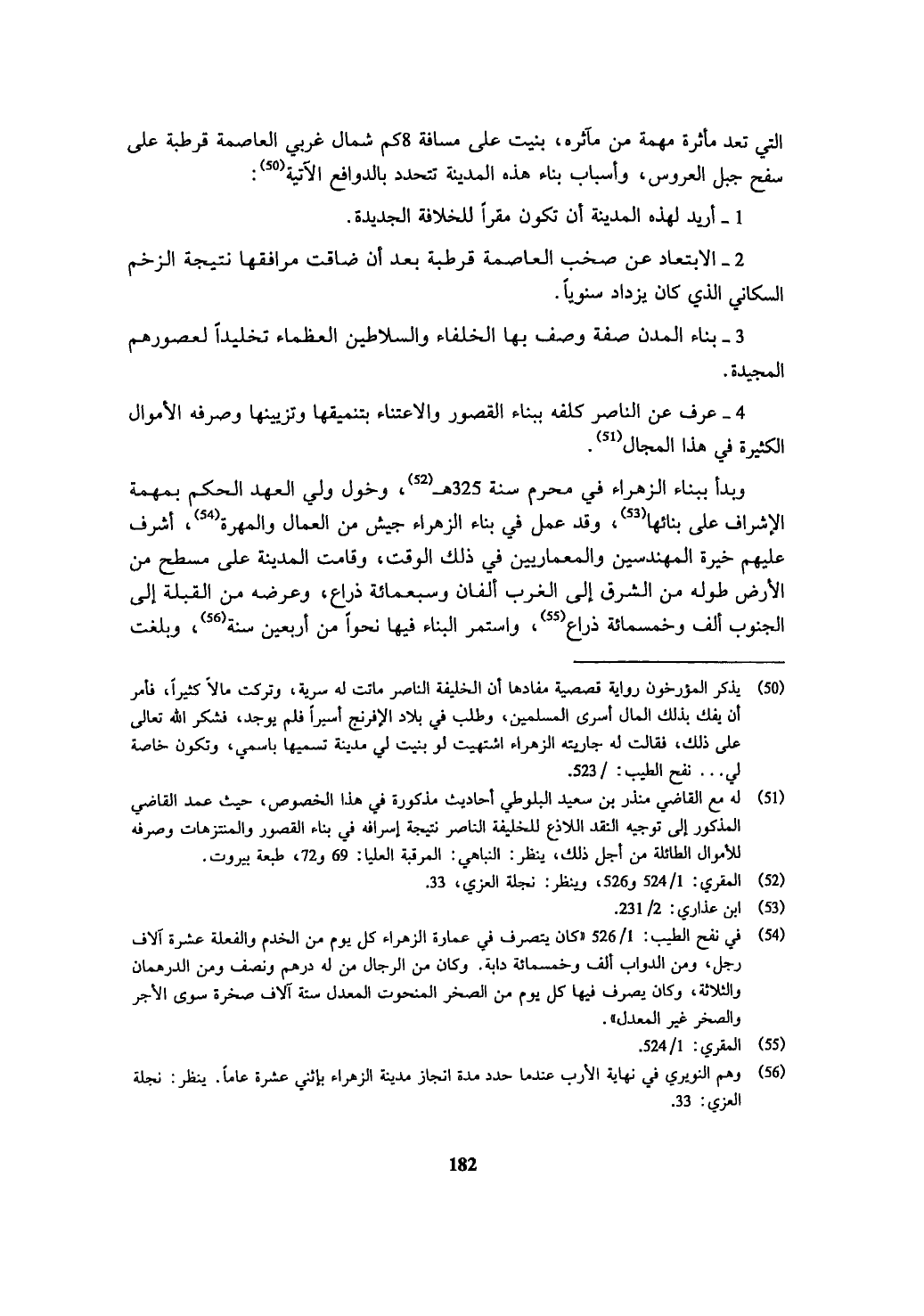 (¬54) في نفح الطيب: 1/ 526 " كان يتصرف في عمارة الزهراء كل يوم من الخدم والفعلة عشرة آلاف رجل، ومن الدواب ألف وخمسمائة دابة. وكان من الرجال من له درهم ونصف ومن الدرهمان والثلاثة، وكان يصرف فيها كل يوم من الصخر المنحوت المعدل ستة آلاف صخرة سوى الأجر والصخر غير المعدل ".