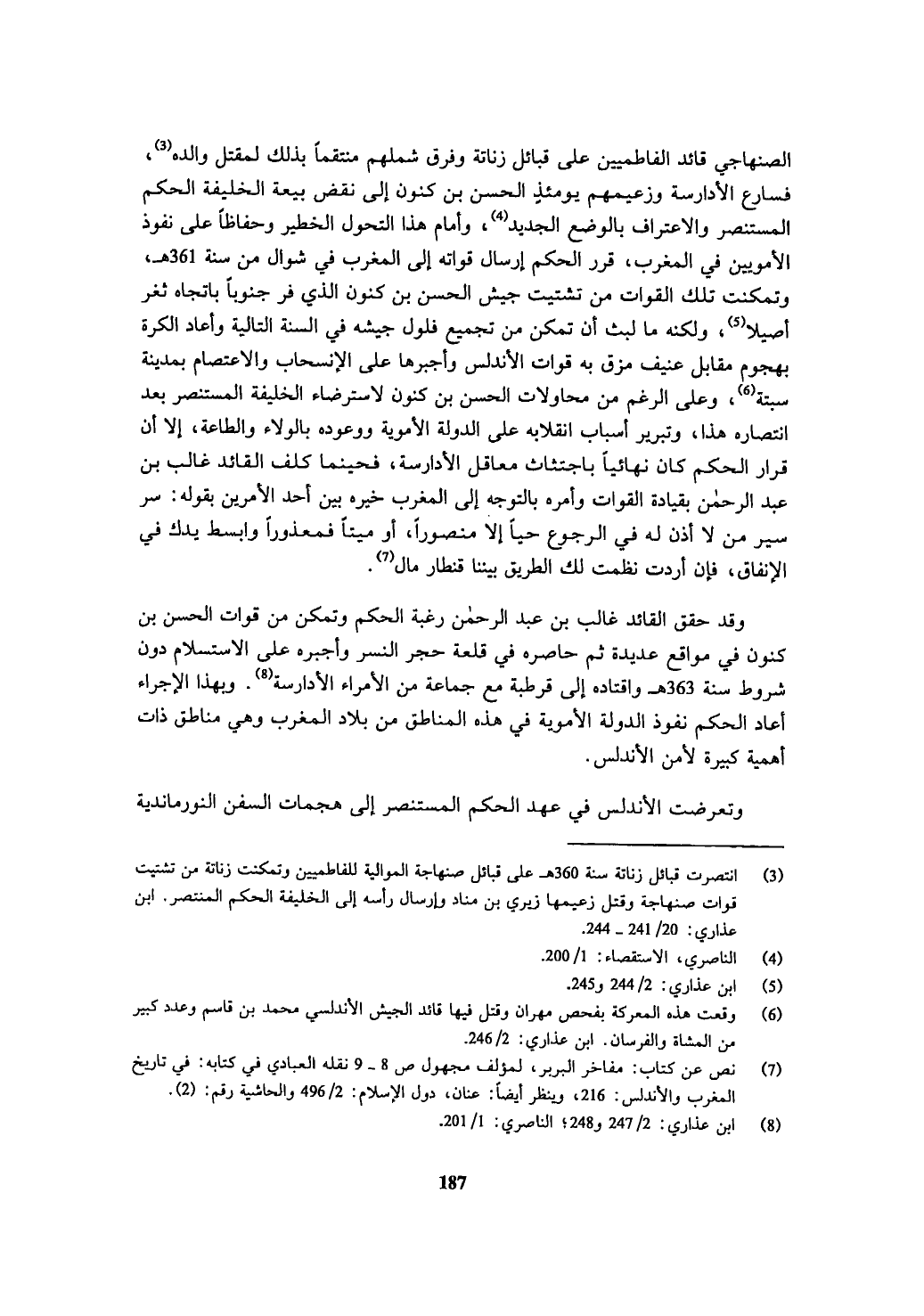 وقد حقق القائد غالب بن عبد الرحمن رغبة الحكم وتمكن من قوات الحسن بن كنون في مواقع عديدة ثم حاصره في قلعة حجر النسر وأجبره على الاستسلام دون شروط سنة 363 هـ واقتاده إلى قرطبة مع جماعة من الأمراء الأدارسة (¬8). وبهذا الإجراء أعاد الحكم نفوذ الدولة الأموية في هذه المناطق من بلاد المغرب وهي مناطق ذات أهمية كبيرة لأمن الأندلس.