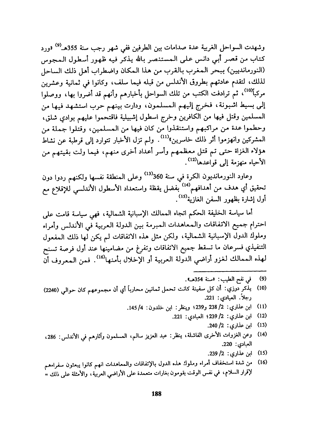 وشهدت السواحل الغربية عدة صدامات بين الطرفين ففي شهر رجب سنة 355 هـ (¬9) " ورد كتاب من قصر أبي دانس على المستنصر بالله يذكر فيه ظهور أسطول المجوس (النورمانديين) ببحر المغرب بالقرب من هذا المكان واضطراب أهل ذلك الساحل لذلك، لتقدم عادتهم بطروق الأندلس من قبله فيما سلف، وكانوا في ثمانية وعشرين مركباً (¬10)، ثم ترادفت الكتب من تلك السواحل بأخبارهم وأنهم قد أضروا بها، ووصلوا إلى بسيط أشبونة، فخرج إليهم المسلمون، ودارت بينهم حرب استشهد فيها من المسلمين وقتل فيها من الكافرين وخرج أسطول إشبيلية فاقتحموا عليهم بوادي شلق، وحطموا عدة من مراكبهم واستنقذوا من كان فيها من المسلمين، وقتلوا جملة من المشركين وانهزموا أثر ذلك خاسرين " (¬11). ولم تزل الأخبار تتوارد إلى قرطبة عن نشاط هؤلاء الغزاة حتى تم قتل معظمهم وأسر أعداد أخرى منهم، فيما ولت بقيتهم من الأحياء منهزمة إلى قواعدها (¬12).