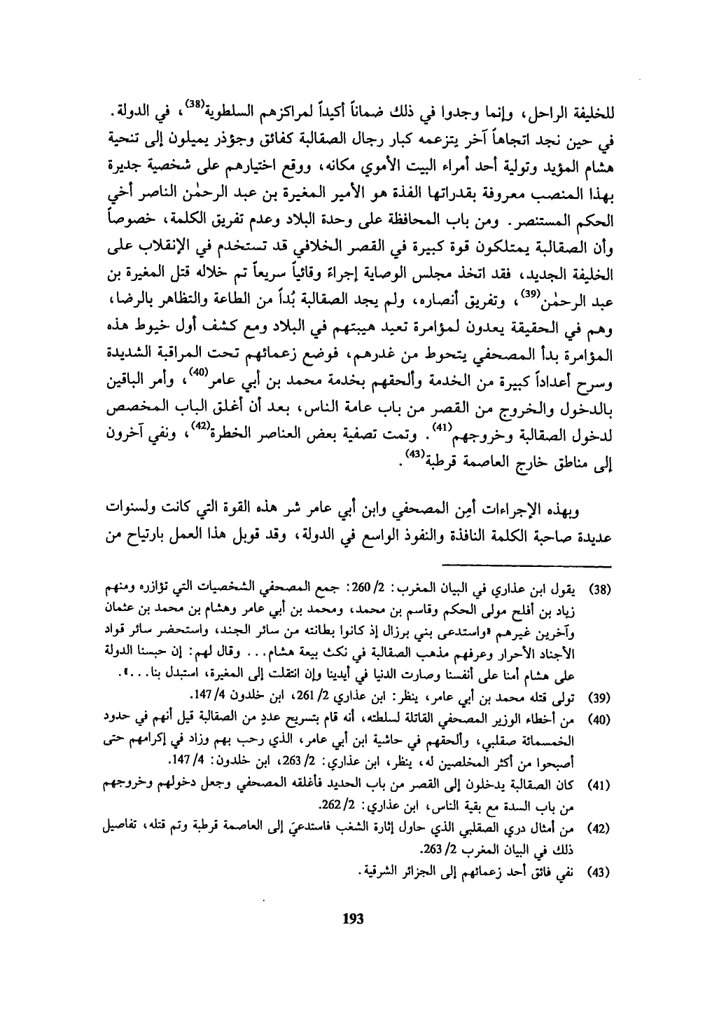 (¬38) يقول ابن عذاري في البيان المغرب: 2/ 260: جمع المصحفي الشخصيات التي تؤازره ومنهم زياد بن أفلح مولى الحكم وقاسم بن محمد، ومحمد بن أبي عامر وهشام بن محمد بن عثمان وآخرين غيرهم " واستدعى بني برزال إذ كانوا بطانته من سائر الجند، واستحضر سائر قواد الأجناد الأحرار وعرفهم مذهب الصقالبة في نكث بيعة هشام ... وقال لهم: إن حبسنا الدولة على هشام أمنا على أنفسنا وصارت الدنيا في أيدينا وإن انتقلت إلى المغيرة، استبدل بنا ... ".