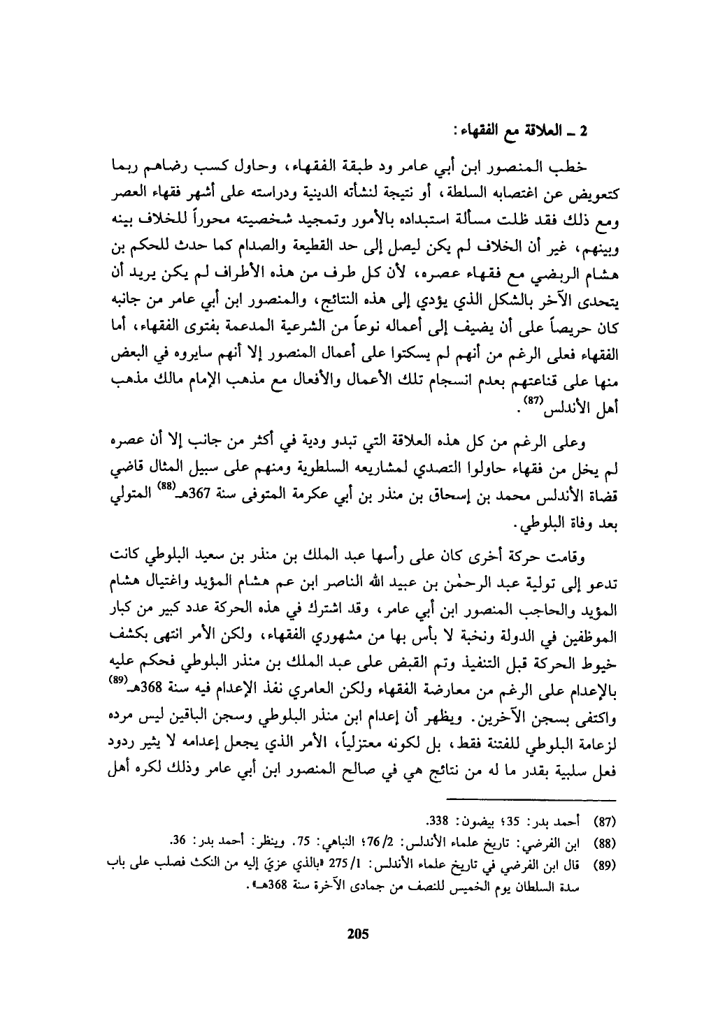 خطب المنصور ابن أبي عامر ود طبقة الفقهاء، وحاول كسب رضاهم ربما كتعويض عن اغتصابه السلطة، أو نتيجة لنشأته الدينية ودراسته على أشهر فقهاء العصر ومع ذلك فقد ظلت مسألة استبداده بالأمور وتمجيد شخصيته محوراً للخلاف بينه وبينهم، غير أن الخلاف لم يكن ليصل إلى حد القطيعة والصدام كما حدث للحكم بن هشام الربضي مع فقهاء عصره، لأن كل طرف من هذه الأطراف لم يكن يريد أن يتحدى الآخر بالشكل الذي يؤدي إلى هذه النتائج، والمنصور ابن أبي عامر من جانبه كان حريصاً على أن يضيف إلى أعماله نوعاً من الشرعية المدعمة بفتوى الفقهاء، أما الفقهاء فعلى الرغم من أنهم لم يسكتوا على أعمال المنصور إلا أنهم سايروه في البعض منها على قناعتهم بعدم انسجام تلك الأعمال والأفعال مع مذهب الإمام مالك مذهب أهل الأندلس (¬87).