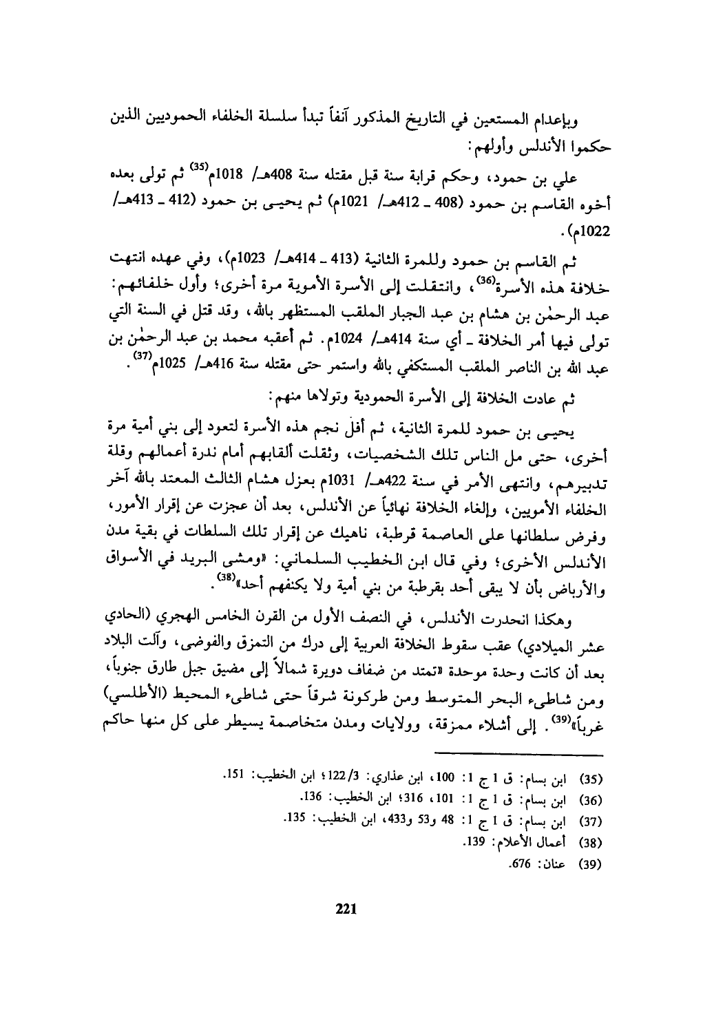 يحيى بن حمود للمرة الثانية، ثم أفلَ نجم هذه الأسرة لتعود إلى بني أمية مرة أخرى، حتى مل الناس تلك الشخصيات، وثقلت ألقابهم أمام ندرة أعمالهم وقلة تدبيرهم، وانتهى الأمر في سنة 422 هـ/1031 م بعزل هشام الثالث المعتد بالله آخر الخلفاء الأمويين، وإلغاء الخلافة نهائياً عن الأندلس، بعد أن عجزت عن إقرار الأمور، وفرض سلطانها على العاصمة قرطبة، ناهيك عن إقرار تلك السلطات في بقية مدن الأندلس الأخرى؛ وفي قال ابن الخطيب السلماني: " ومشى البريد في الأسواق والأرباض بأن لا يبقى أحد بقرطبة من بني أمية ولا يكنفهم أحد " (¬38).