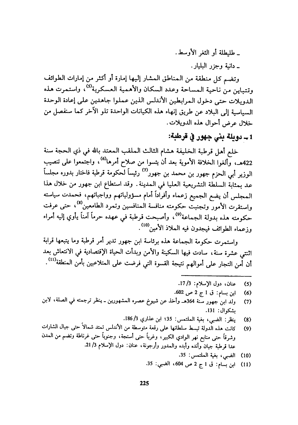 (¬9) كانت هذه الدولة تبسط سلطانها على رقعة متوسطة من الأندلس تمتد شمالاً حتى جبال الشارات وشرقاً حتى منابع نهر الوادي الكبير، وغرباً حتى أستجة، وجنوباً حتى غرناطة وتضم من المدن عدا قرطبة جيان وأنده وأبده والمدور وأرجونة، عنان: دول الإسلام 3/ 21.