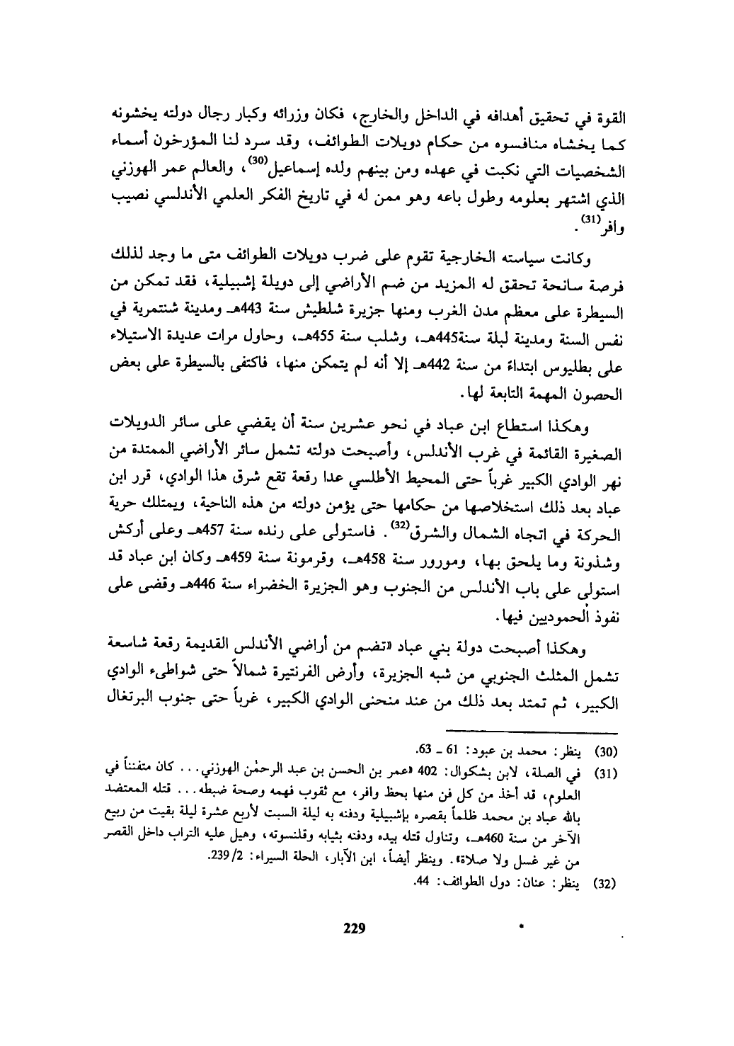 (¬31) في الصلة، لابن بشكوال: 402 " عمر بن الحسن بن عبد الرحمن الهوزني ... كان متفنناً في العلوم، قد أخذ من كل فن منها بحظ وافر، مع ثقوب فهمه وصحة ضبطه ... قتله المعتضد بالله عباد بن محمد ظلماً بقصره بإشبيلية ودفنه به ليلة السبت لأربع عشرة ليلة بقيت من ربيع الآخر من سنة 460 هـ، وتناول قتله بيده ودفنه بثيابه وقلنسوته، وهيل عليه التراب داخل القصر من غير غسل ولا صلاة ". وينظر أيضاً، ابن الآبار، الحلة السيراء: 2/ 239.
