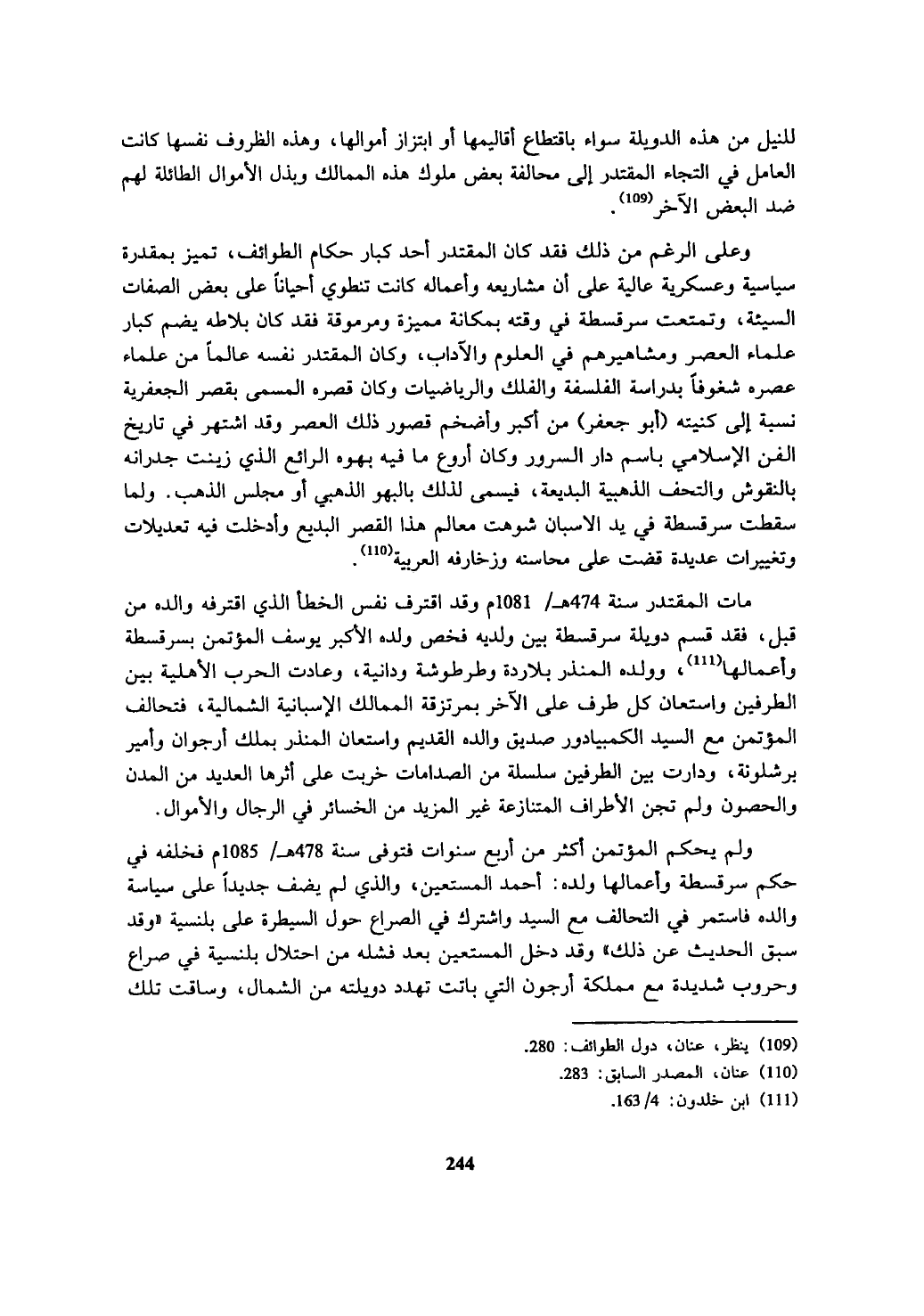 مات المقتدر سنة 474 هـ/1081 م وقد اقترف نفس الخطأ الذي اقترفه والده من قبل، فقد قسم دويلة سرقسطة بين ولديه فخص ولده الأكبر يوسف المؤتمن بسرقسطة وأعمالها (¬111)، وولده المنذر بلاردة وطرطوشة ودانية، وعادت الحرب الأهلية بين الطرفين واستعان كل طرف على الآخر بمرتزقة الممالك الإسبانية الشمالية، فتحالف المؤتمن مع السيد الكمبيادور صديق والده القديم واستعان المنذر بملك أرجوان وأمير برشلونة، ودارت بين الطرفين سلسلة من الصدامات خربت على أثرها العديد من المدن والحصون ولم تجن الأطراف المتنازعة غير المزيد من الخسائر في الرجال والأموال.