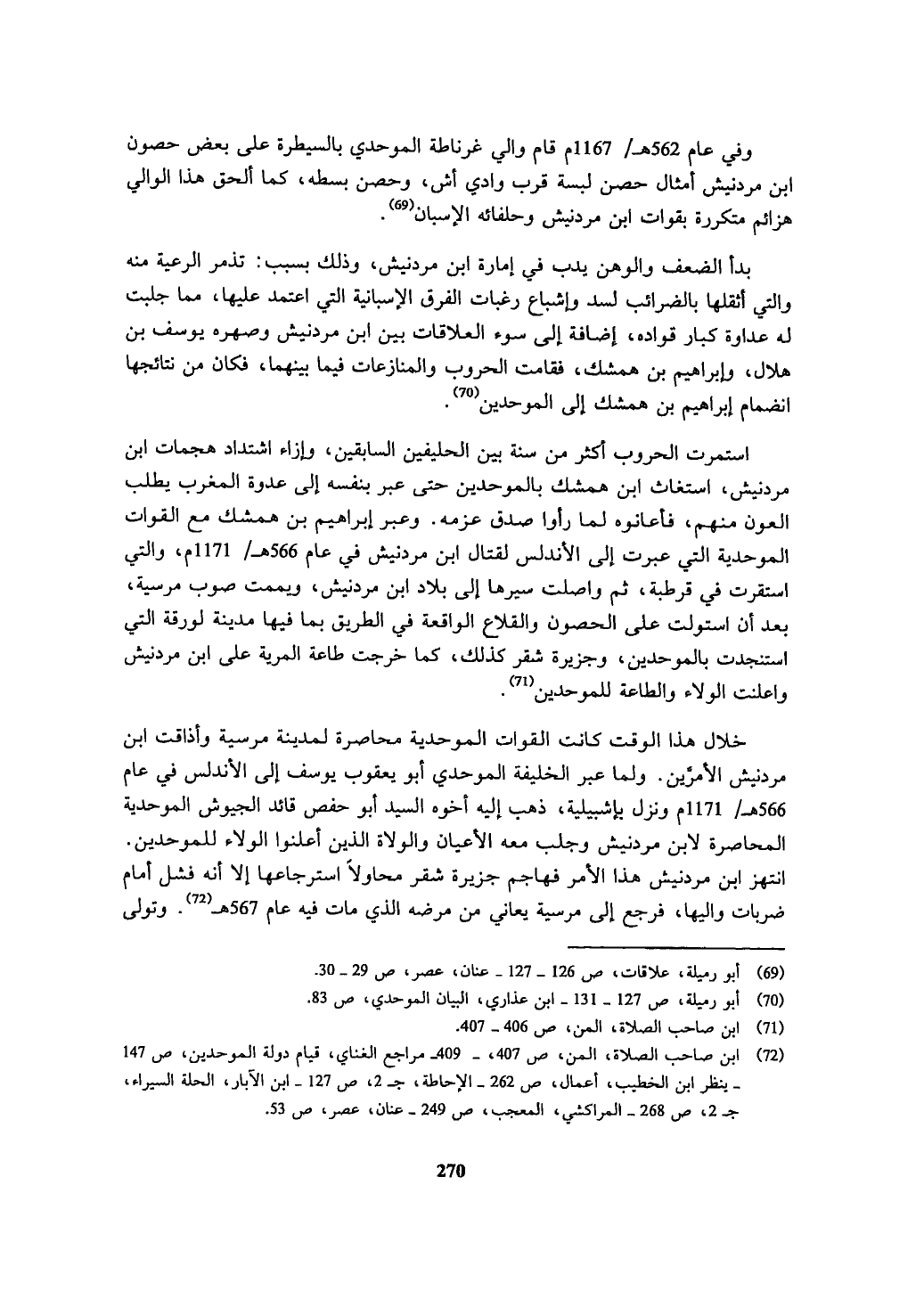 (¬72) ابن صاحب الصلاة، المن، ص 407 - 409 - مراجع الغناي، قيام دولة الموحدين، ص 147 - ينظر ابن الخطيب، أعمال، ص 262 - الإحاطة، ج 2، ص 127 - ابن الآبار، الحلة السيراء، ج 2، ص 268 - المراكشي، المعجب، ص 249 - عنان، عصر، ص 53.