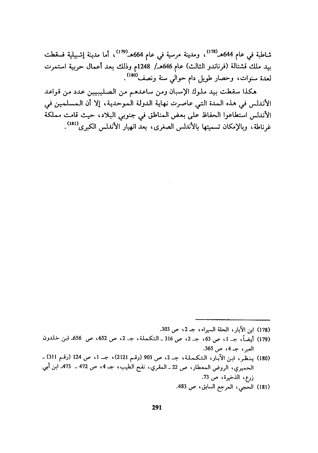 شاطبة في عام 644 هـ (¬178)، ومدينة مرسية في عام 664 هـ (¬179)، أما مدينة إشبيلية فسقطت بيد ملك قشتالة (فرناندو الثالث) عام 646 هـ/1248 م وذلك بعد أعمال حربية استمرت لعدة سنوات، وحصار طويل دام حوالي سنة ونصف (¬180).