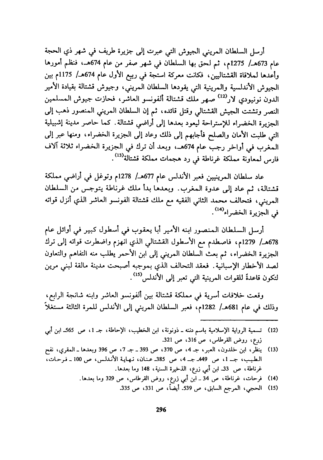 (¬13) ينظر، ابن خلدون، العبر، ج 4، ص 370، ص 393 - ج 7، ص 396 وبعدها - المقري، نفح الطيب، ج 1، ص 449 - ج 4، ص 385 - عنان، نهاية الأندلس، ص 100 - فرحات، غرناطة، ص 33 - ابن أبي زرع، الذخيرة السنية، 148 وما بعدها.