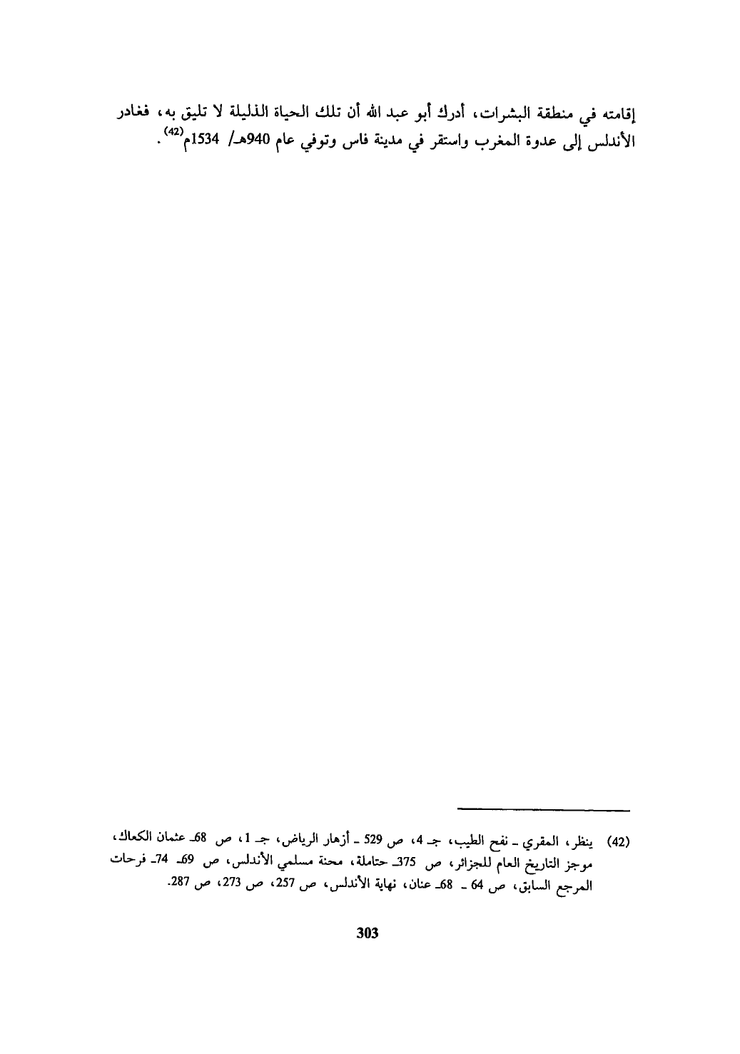 (¬42) ينظر، المقري - نفح الطيب، ج 4، ص 529 - أزهار الرياض، ج 1، ص 68 - عثمان الكعاك، موجز التاريخ العام للجزائر، ص 375 حتاملة، محنة مسلمي الأندلس، ص 69 - 74 - فرحات المرجع السابق، ص 64 - 68 - عنان، نهاية الأندلس؛ ص 257، ص 273، ص 287.
