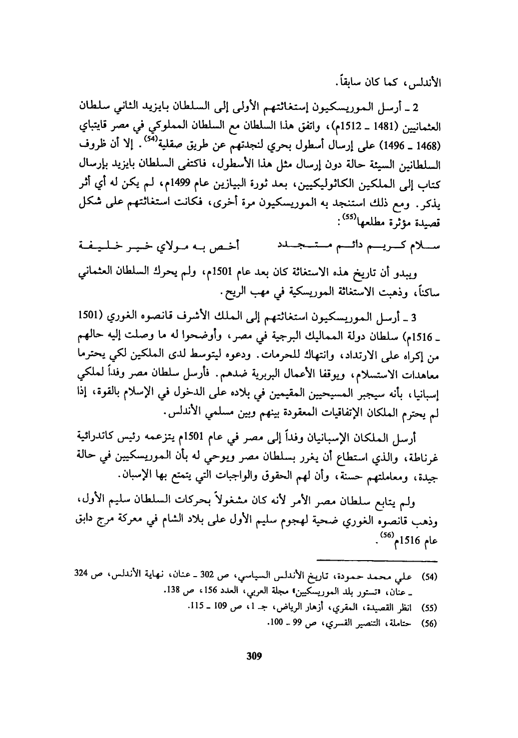 2 - أرسل الموريسكيون إستغاثتهم الأولى إلى السلطان بايزيد الثاني سلطان العثمانيين (1481 - 1512 م)، واتفق هذا السلطان مع السلطان المملوكي في مصر قايتباي (1468 - 1496) على إرسال أسطول بحري لنجدتهم عن طريق صقلية (¬54). إلا أن ظروف السلطانين السيئة حالت دون إرسال مثل هذا الأسطول، فاكتفى السلطان بايزيد بإرسال كتاب إلى الملكين الكاثوليكيين، بعد ثورة البيازين عام 1499 م، لم يكن له أي أثر يذكر. ومع ذلك استنجد به الموريسكيون مرة أخرى، فكانت استغاثتهم على شكل قصيدة مؤثرة مطلعها (¬55):