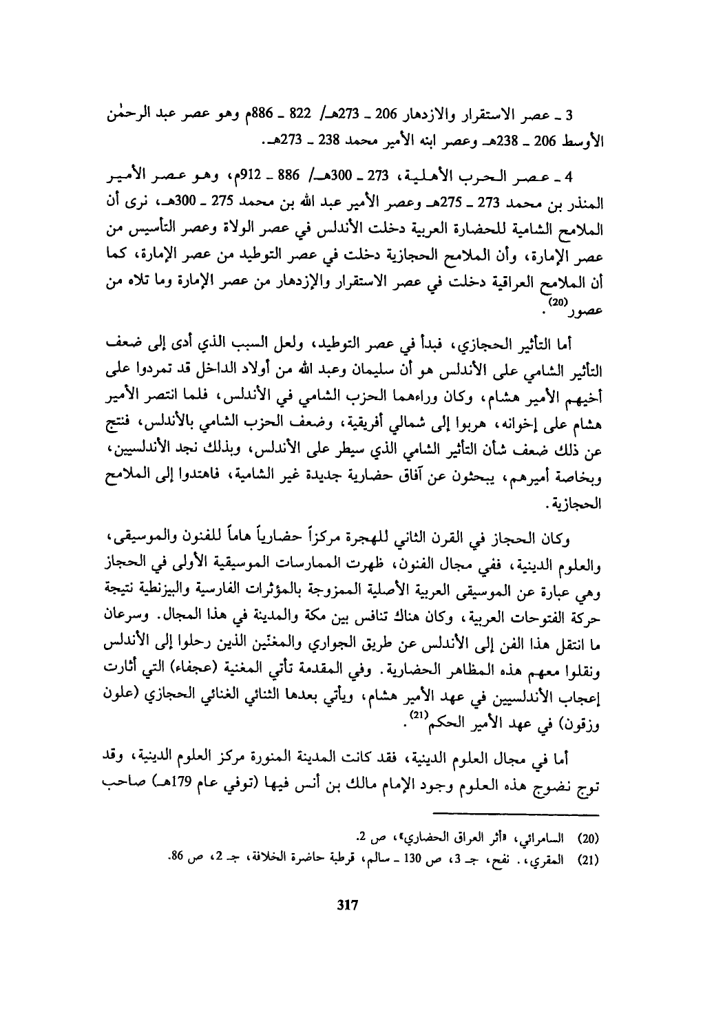 4 - عصر الحرب الأهلية، 273 - 300 هـ/886 - 912 م، وهو عصر الأمير المنذر بن محمد 273 - 275 هـ وعصر الأمير عبد الله بن محمد 275 - 300 هـ، نرى أن الملامح الشامية للحضارة العربية دخلت الأندلس في عصر الولاة وعصر التأسيس من عصر الإمارة، وأن الملامح الحجازية دخلت في عصر التوطيد من عصر الإمارة، كما أن الملامح العراقية دخلت في عصر الاستقرار والإزدهار من عصر الإمارة وما تلاه من عصور (¬20).