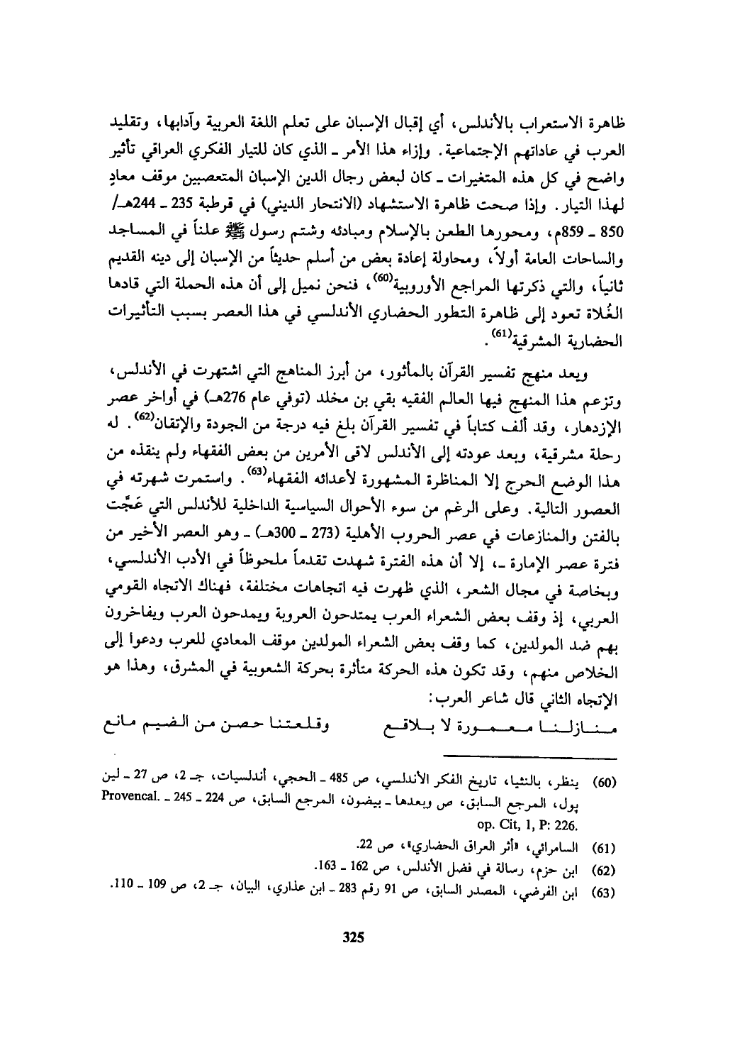ظاهرة الاستعراب بالأندلس، أي إقبال الإسبان على تعلم اللغة العربية وآدابها، وتقليد العرب في عاداتهم الإجتماعية. وإزاء هذا الأمر -الذي كان للتيار الفكري العراقي تأثير واضح في كل هذه المتغيرات- كان لبعض رجال الدين الإسبان المتعصبين موقف معادٍ لهذا التيار. وإذا صحت ظاهرة الاستشهاد (الانتحار الديني) في قرطبة 235 - 244 هـ/ 850 - 859 م، ومحورها الطعن بالإسلام ومبادئه وشتم رسول الله صلى الله عليه وسلم علناً في المساجد والساحات العامة أولاً، ومحاولة إعادة بعض من أسلم حديثاً من الإسبان إلى دينه القديم ثانياً، والتي ذكرتها المراجع الأوروبية (¬60)، فنحن نميل إلى أن هذه الحملة التي قادها الغُلاة تعود إلى ظاهرة التطور الحضاري الأندلسي في هذا العصر بسبب التأثيرات الحضارية المشرقية (¬61).