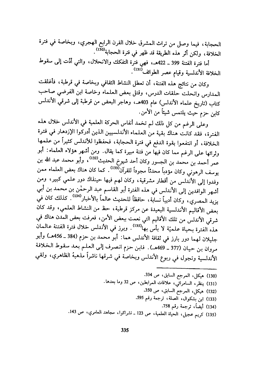 وعلى الرغم من كل ذلك لم تخمد أنفاس الحركة العلمية في الأندلس خلال هذه الفترة، فقد كانت هناك بقية من العلماء الأندلسيين الذين أدركوا الإزدهار في فترة الخلافة، أو انتفعوا بقوة الدفع في فترة الحجابة، فحفظوا للأندلس كثيراً من علمها وثرائها على الرغم مما كان فيها من فتنة مبيرة كما يقال. ومن أشهر هؤلاء العلماء: أبو عمر أحمد بن محمد بن الجسور وكان أحد شيوخ الحديث (¬132)، وأبو محمد عبد الله بن يوسف الرهوني وكان مؤدباً محدثاً مجوداً للقرآن (¬133). كما كان هناك بعض العلماء ممن وفدوا إلى الأندلس من أقطار مشرقية، وكان لهم فيها حينذاك دور علمي كبير، ومن أشهر الوافدين إلى الأندلس في هذه الفترة أبو القاسم عبد الرحمن بن محمد بن أبي يزيد المصري، وكان أديباً نسابة، حافظاً للحديث عالماً بالأخبار (¬134). كذلك كان في بعض الأقاليم الأندلسية البعيدة عن مركز قرطبة، حظ من النشاط العلمي، وقد كان شرقي الأندلس من تلك الأقاليم التي نعمت ببعض الأمن، فعُرفت بعض المدن هناك في هذه الفترة بحياة علميّة لا بأس بها (¬135). وبرز في الأندلس خلال فترة الفتنة عالمان جليلان لهما دور بارز في ثقافة الأندلس هما: أبو محمد بن حزم (384 - 456 هـ) وأبو مروان بن حيان (377 - 469 هـ). فابن حزم انصرف إلى العلم بعد سقوط الخلافة الأندلسية وتجول في ربوع الأندلس وبخاصة في شرقها ناشراً مذهبهُ الظاهري، ولقي