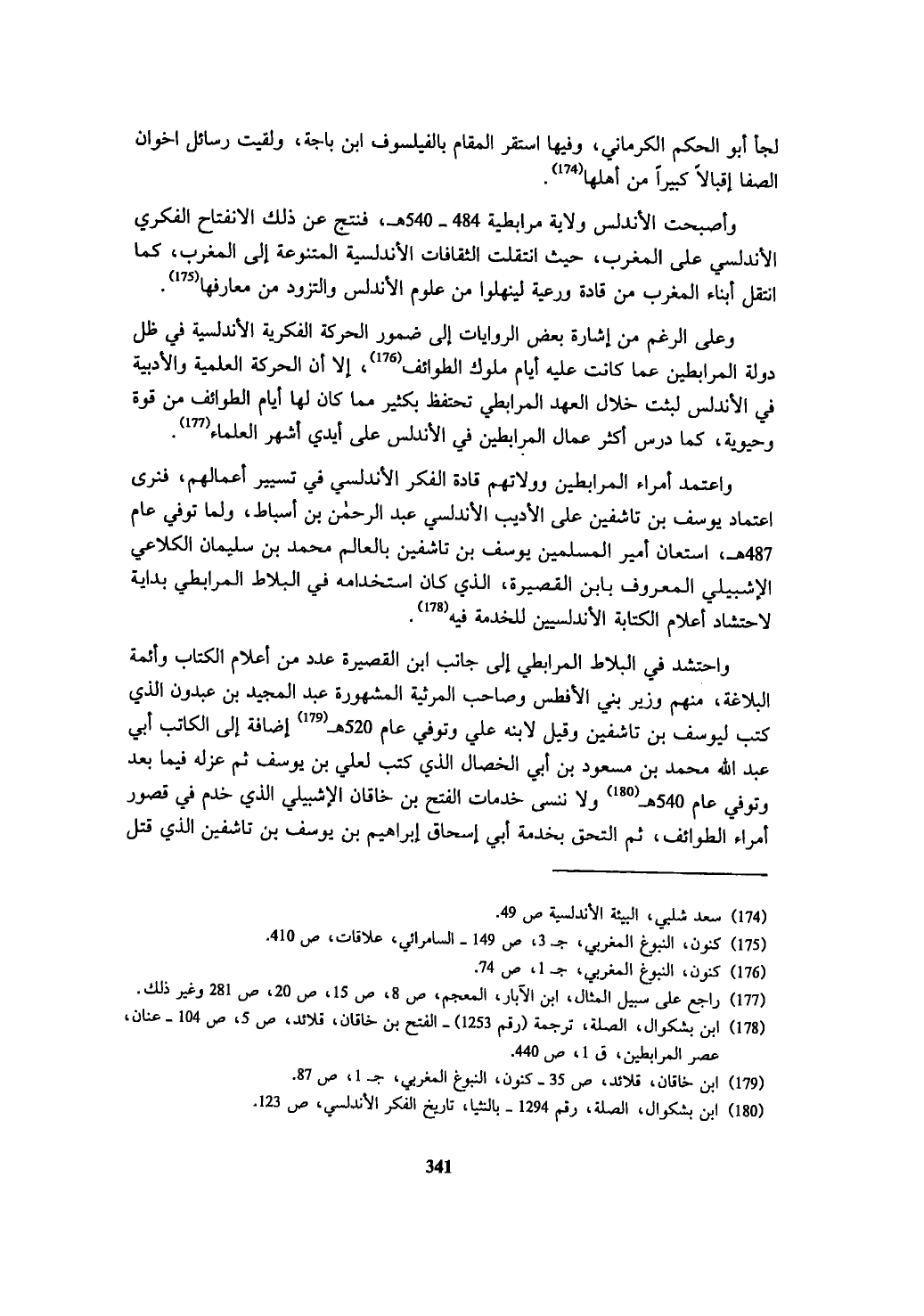 وعلى الرغم من إشارة بعض الروايات إلى ضمور الحركة الفكرية الأندلسية في ظل دولة المرابطين عما كانت عليه أيام ملوك الطوائف (¬176)، إلا أن الحركة العلمية والأدبية في الأندلس لبثت خلال العهد المرابطي تحتفظ بكثير مما كان لها أيام الطوائف من قوة وحيوية، كما درس أكثر عمال المرابطين في الأندلس على أيدي أشهر العلماء (¬177).