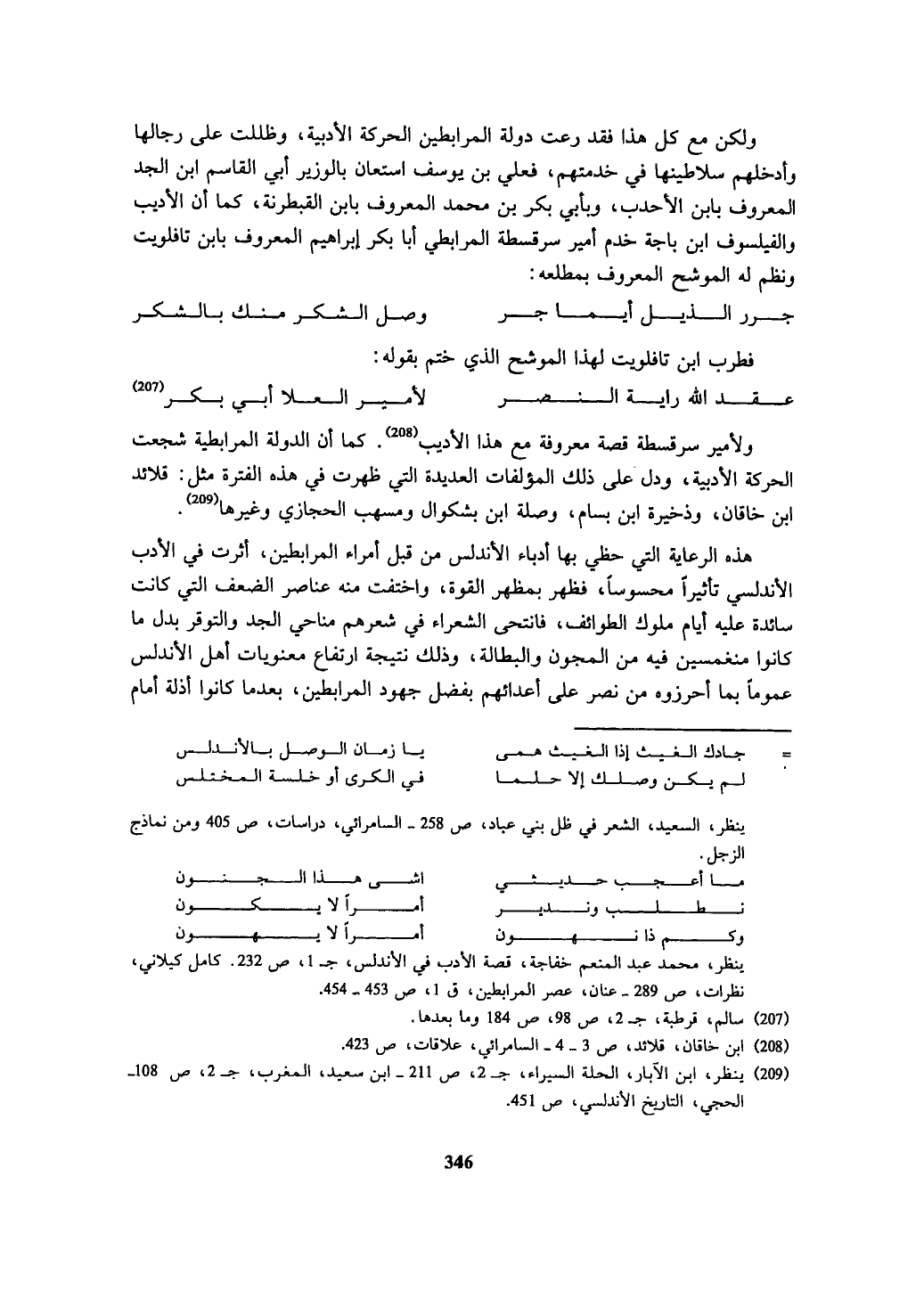 ينظر، محمد عبد المنعم خفاجة، قصة الأدب في الأندلس، ج 1، ص 232. كامل كيلاني، نظرات، ص 289 - عنان، عصر المرابطين، ق 1، ص 453 - 454.
