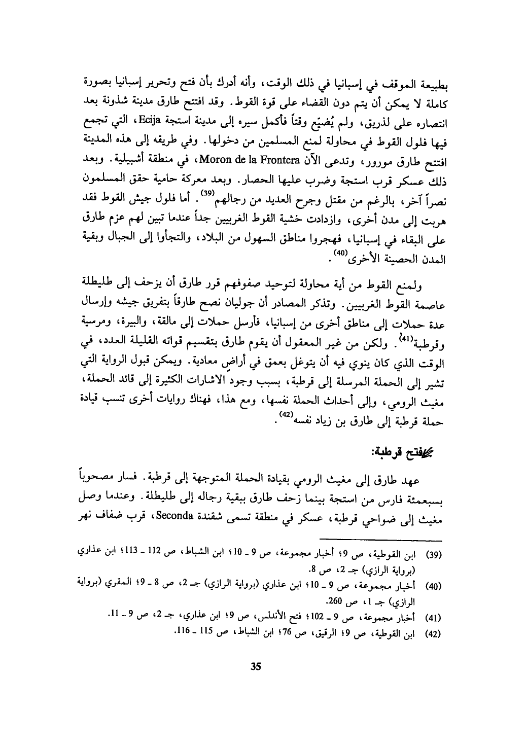 بطبيعة الموقف في إسبانيا في ذلك الوقت، وأنه أدرك بأن فتح وتحرير إسبانيا بصورة كاملة لا يمكن أن يتم دون القضاء على قوة القوط. وقد افتتح طارق مدينة شذونة بعد انتصاره على لذريق، ولم يُضيّع وقتاً فأكمل سيره إلى مدينة استجة Ecija، التي تجمع فيها فلول القوط في محاولة لمنع المسلمين من دخولها. وفي طريقه إلى هذه المدينة افتتح طارق مورور، وتدعى الآن Moron de la Frontera، في منطقة أشبيلية. وبعد ذلك عسكر قرب استجة وضرب عليها الحصار. وبعد معركة حامية حقق المسلمون نصراً آخر، بالرغم من مقتل وجرح العديد من رجالهم (¬39). أما فلول جيش القوط فقد هربت إلى مدن أخرى، وازدادت خشية القوط الغربيين جداً عندما تبين لهم عزم طارق على البقاء في إسبانيا، فهجروا مناطق السهول من البلاد، والتجأوا إلى الجبال وبقية المدن الحصينة الأخرى (¬40).