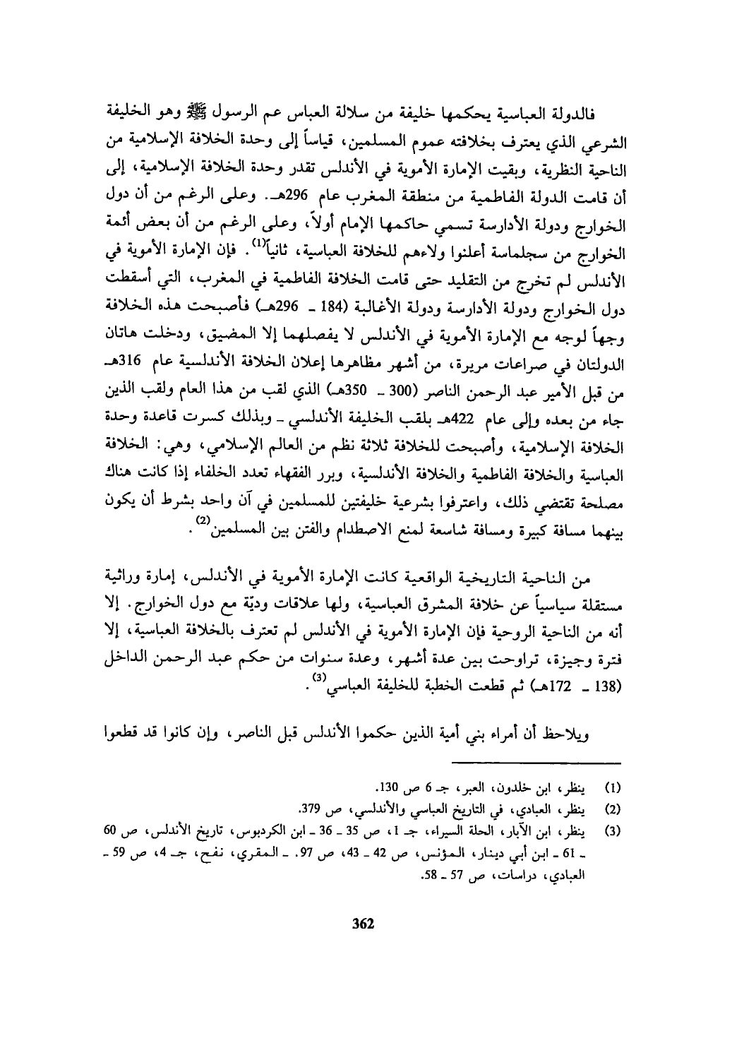 فالدولة العباسية يحكمها خليفة من سلالة العباس عم الرسول صلى الله عليه وسلم وهو الخليفة الشرعي الذي يعترف بخلافته عموم المسلمين، قياساً إلى وحدة الخلافة الإسلامية من الناحية النظرية، وبقيت الإمارة الأموية في الأندلس تقدر وحدة الخلافة الإسلامية، إلى أن قامت الدولة الفاطمية من منطقة المغرب عام 296 هـ. وعلى الرغم من أن دول الخوارج ودولة الأدارسة تسمي حاكمها الإمام أولاً، وعلى الرغم من أن بعض أئمة الخوارج من سجلماسة أعلنوا ولاءهم للخلافة العباسية، ثانياً (¬1). فإن الإمارة الأموية في الأندلس لم تخرج من التقليد حتى قامت الخلافة الفاطمية في المغرب، التي أسقطت دول الخوارج ودولة الأدارسة ودولة الأغالبة (184 - 296 هـ) فأصبحت هذه الخلافة وجهاً لوجه مع الإمارة الأموية في الأندلس لا يفصلهما إلا المضيق، ودخلت هاتان الدولتان في صراعات مريرة، من أشهر مظاهرها إعلان الخلافة الأندلسية عام 316 هـ من قبل الأمير عبد الرحمن الناصر (300 - 350 هـ) الذي لقب من هذا العام ولقب الذين جاء من بعده وإلى عام 422 هـ بلقب الخليفة الأندلسي - وبذلك كسرت قاعدة وحدة الخلافة الإسلامية، وأصبحت للخلافة ثلاثة نظم من العالم الإسلامي، وهي: الخلافة العباسية والخلافة الفاطمية والخلافة الأندلسية، وبرر الفقهاء تعدد الخلفاء إذا كانت هناك مصلحة تقتضي ذلك، واعترفوا بشرعية خليفتين للمسلمين في آن واحد بشرط أن يكون بينهما مسافة كبيرة ومسافة شاسعة لمنع الاصطدام والفتن بين المسلمين (¬2).