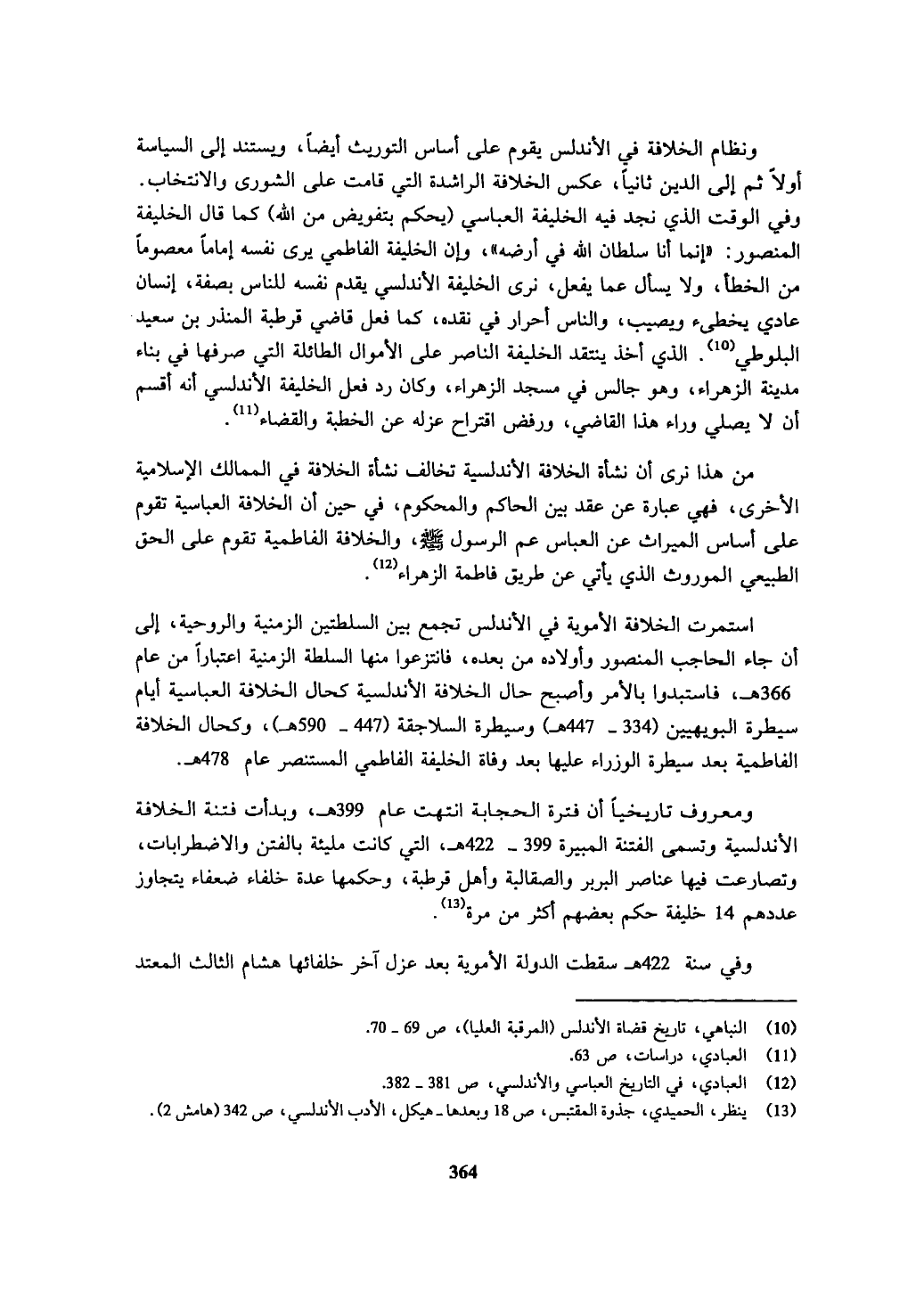 من هذا نرى أن نشأة الخلافة الأندلسية تخالف نشأة الخلافة في الممالك الإسلامية الأخرى، فهي عبارة عن عقد بين الحاكم والمحكوم، في حين أن الخلافة العباسية تقوم على أساس الميراث عن العباس عم الرسول صلى الله عليه وسلم، والخلافة الفاطمية تقوم على الحق الطبيعي الموروث الذي يأتي عن طريق فاطمة الزهراء (¬12).