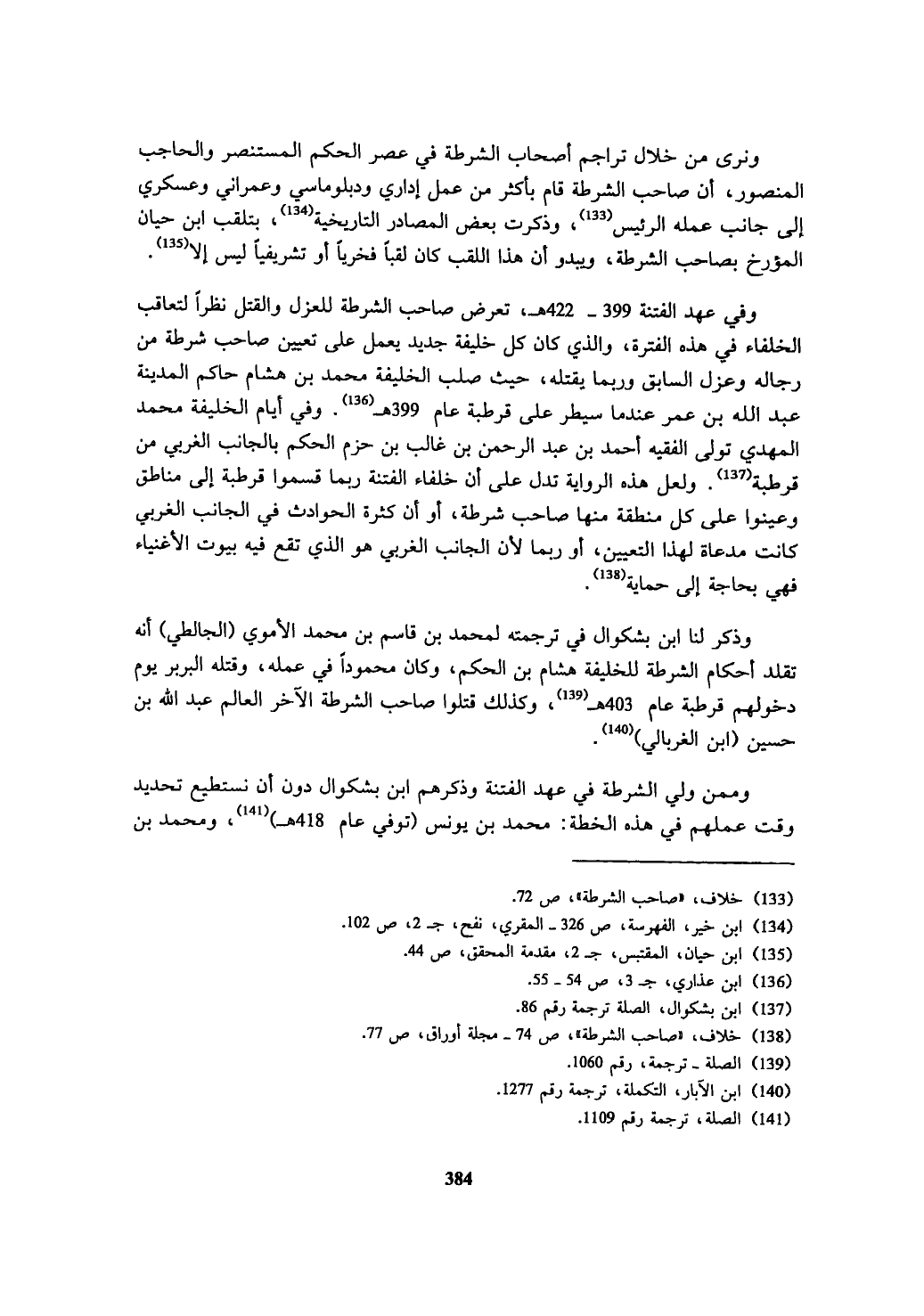 وذكر لنا ابن بشكوال في ترجمته لمحمد بن قاسم بن محمد الأموي (الجالطي) أنه تقلد أحكام الشرطة للخليفة هشام بن الحكم، وكان محموداً في عمله، وقتله البربر يوم دخولهم قرطبة عام 403 هـ (¬139)، وكذلك قتلوا صاحب الشرطة الآخر العالم عبد الله بن حسين (ابن الغربالي) (¬140).