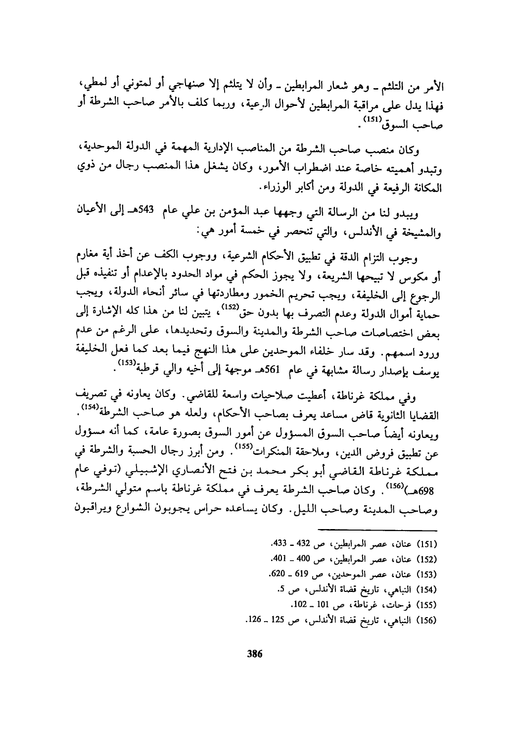 وجوب التزام الدقة في تطبيق الأحكام الشرعية، ووجوب الكف عن أخذ أية مغارم أو مكوس لا تبيحها الشريعة، ولا يجوز الحكم في مواد الحدود بالإعدام أو تنفيذه قبل الرجوع إلى الخليفة، ويجب تحريم الخمور ومطاردتها في سائر أنحاء الدولة، ويجب حماية أموال الدولة وعدم التصرف بها بدون حق (¬152)، يتبين لنا من هذا كله الإشارة إلى بعض اختصاصات صاحب الشرطة والمدينة والسوق وتحديدها، على الرغم من عدم ورود اسمهم. وقد سار خلفاء الموحدين على هذا النهج فيما بعد كما فعل الخليفة يوسف بإصدار رسالة مشابهة في عام 561 هـ موجهة إلى أخيه والي قرطبة (¬153).