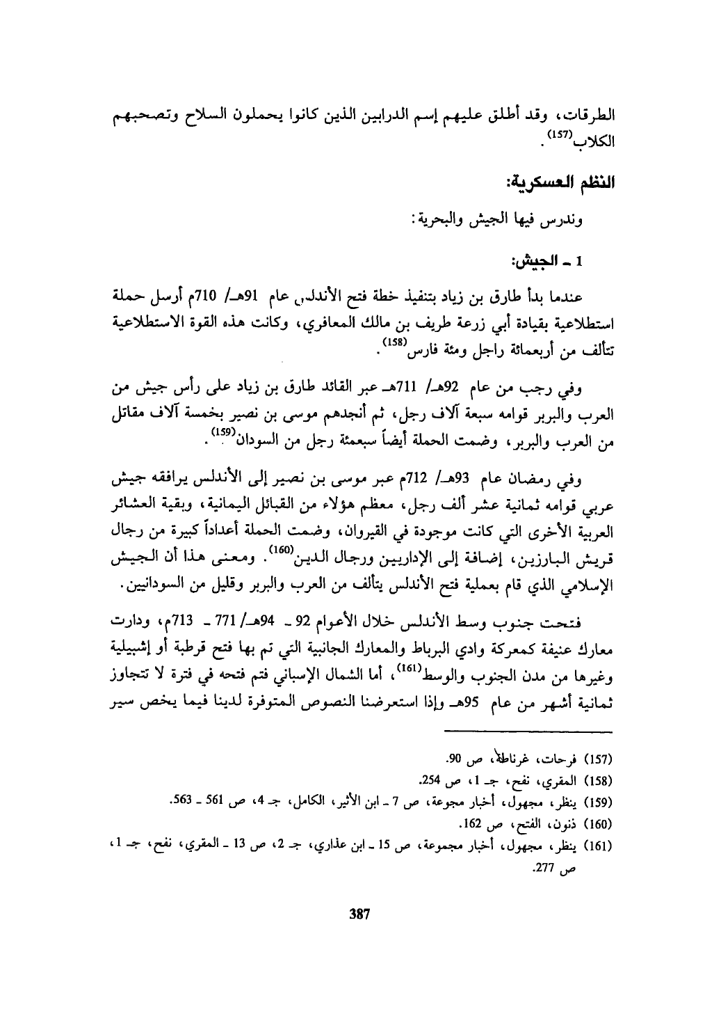 وفي رمضان عام 93 هـ/712 م عبر موسى بن نصير إلى الأندلس يرافقه جيش عربي قوامه ثمانية عشر ألف رجل، معظم هؤلاء من القبائل اليمانية، وبقية العشائر العربية الأخرى التي كانت موجودة في القيروان، وضمت الحملة أعداداً كبيرة من رجال قريش البارزين، إضافة إلى الإداريين ورجال الدين (¬160). ومعنى هذا أن الجيش الإسلامي الذي قام بعملية فتح الأندلس يتألف من العرب والبربر وقليل من السودانيين.