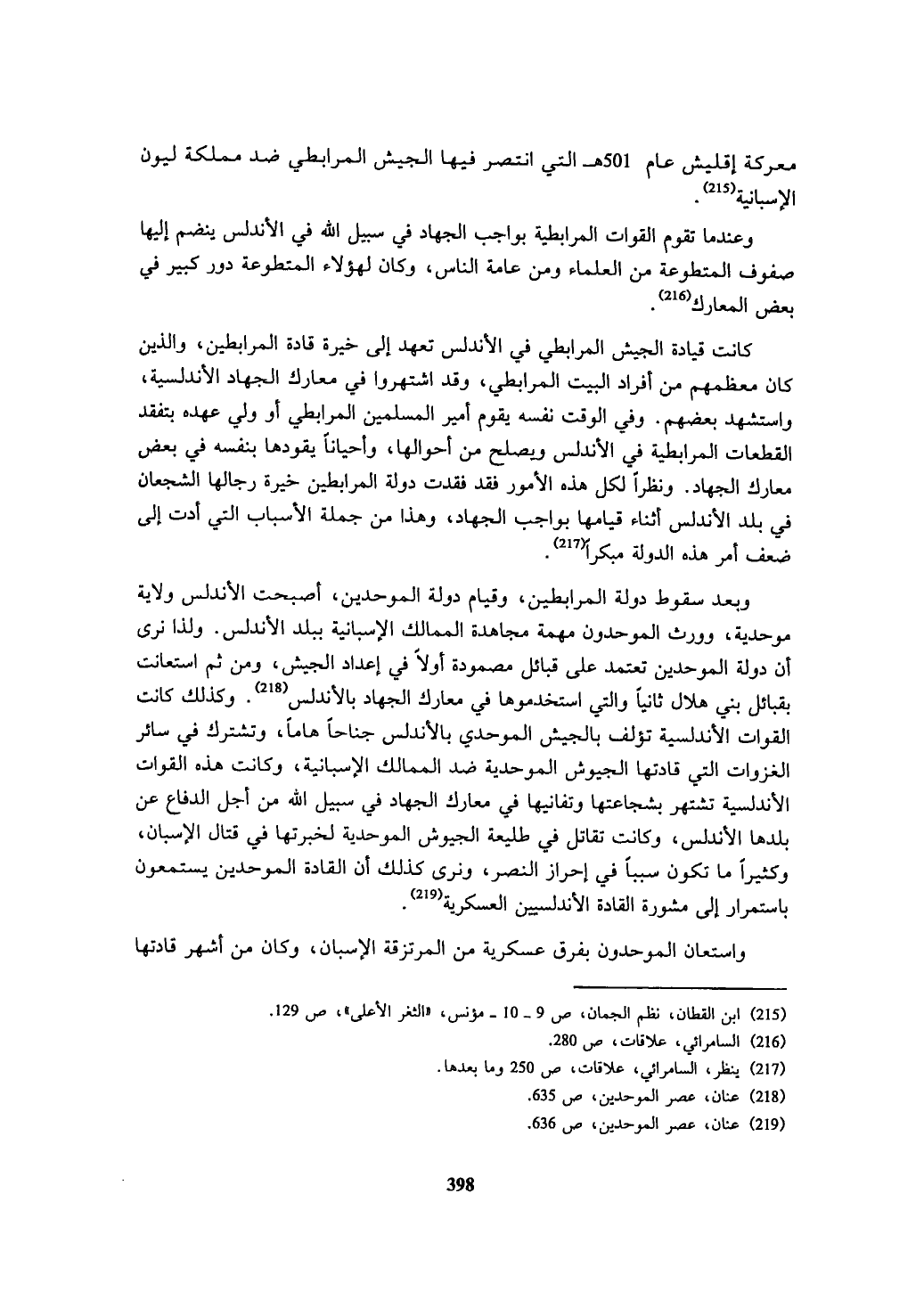وبعد سقوط دولة المرابطين، وقيام دولة الموحدين، أصبحت الأندلس ولاية موحدية، وورث الموحدون مهمة مجاهدة الممالك الإسبانية ببلد الأندلس. ولذا نرى أن دولة الموحدين تعتمد على قبائل مصمودة أولاً في إعداد الجيش، ومن ثم استعانت بقبائل بني هلال ثانياً والتي استخدموها في معارك الجهاد بالأندلس (¬218). وكذلك كانت القوات الأندلسية تؤلف بالجيش الموحدي بالأندلس جناحاً هاماً، وتشترك في سائر الغزوات التي قادتها الجيوش الموحدية ضد الممالك الإسبانية، وكانت هذه القوات الأندلسية تشتهر بشجاعتها وتفانيها في معارك الجهاد في سبيل الله من أجل الدفاع عن بلدها الأندلس، وكانت تقاتل في طليعة الجيوش الموحدية لخبرتها في قتال الإسبان، وكثيراً ما تكون سبباً في إحراز النصر، ونرى كذلك أن القادة الموحدين يستمعون باستمرار إلى مشورة القادة الأندلسيين العسكرية (¬219).