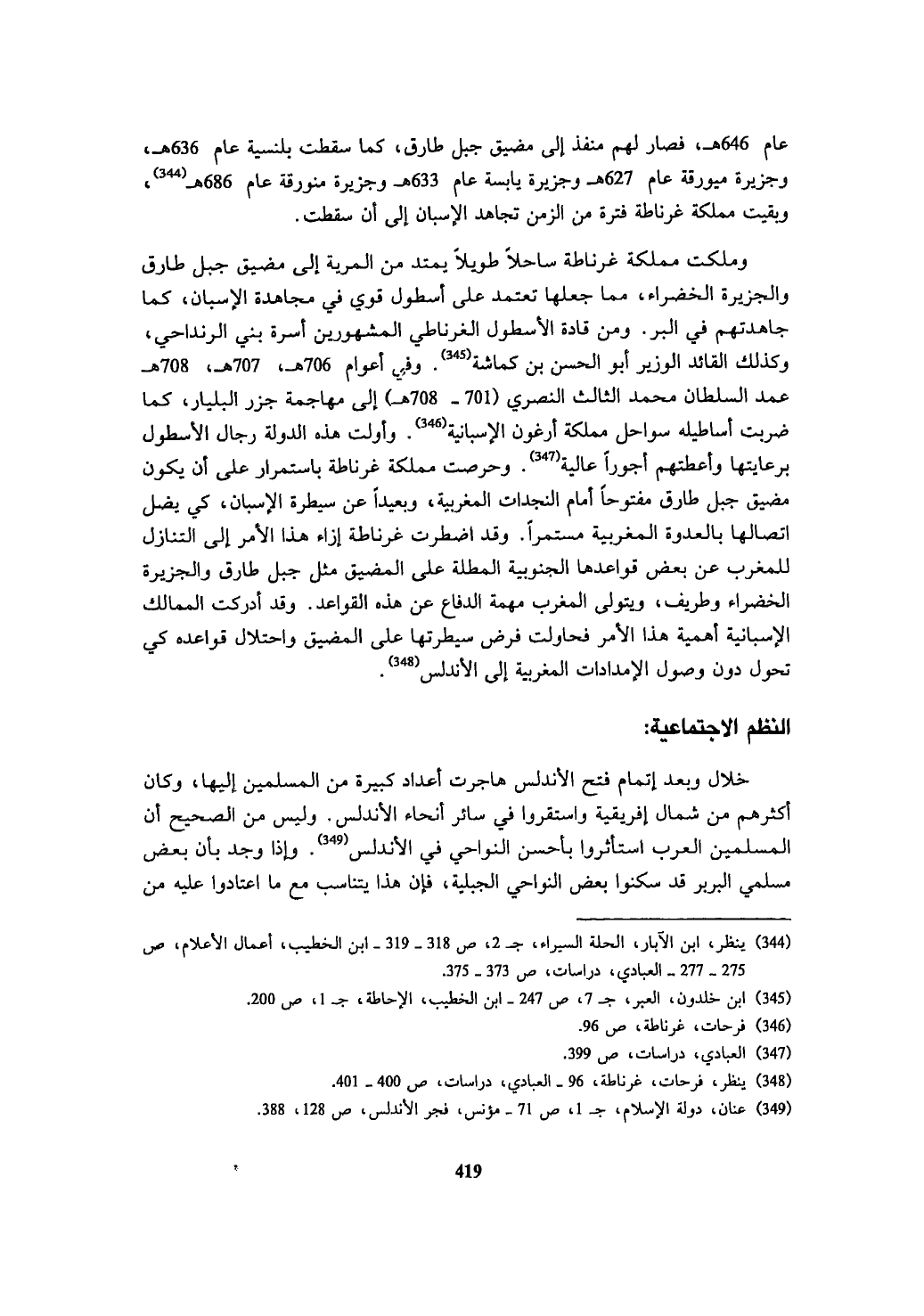 عام 646 هـ، فصار لهم منفذ إلى مضيق جبل طارق، كما سقطت بلنسية عام 636 هـ، وجزيرة ميورقة عام 627 هـ وجزيرة يابسة عام 633 هـ وجزيرة منورقة عام 686 هـ (¬344)، وبقيت مملكة غرناطة فترة من الزمن تجاهد الإسبان إلى أن سقطت.