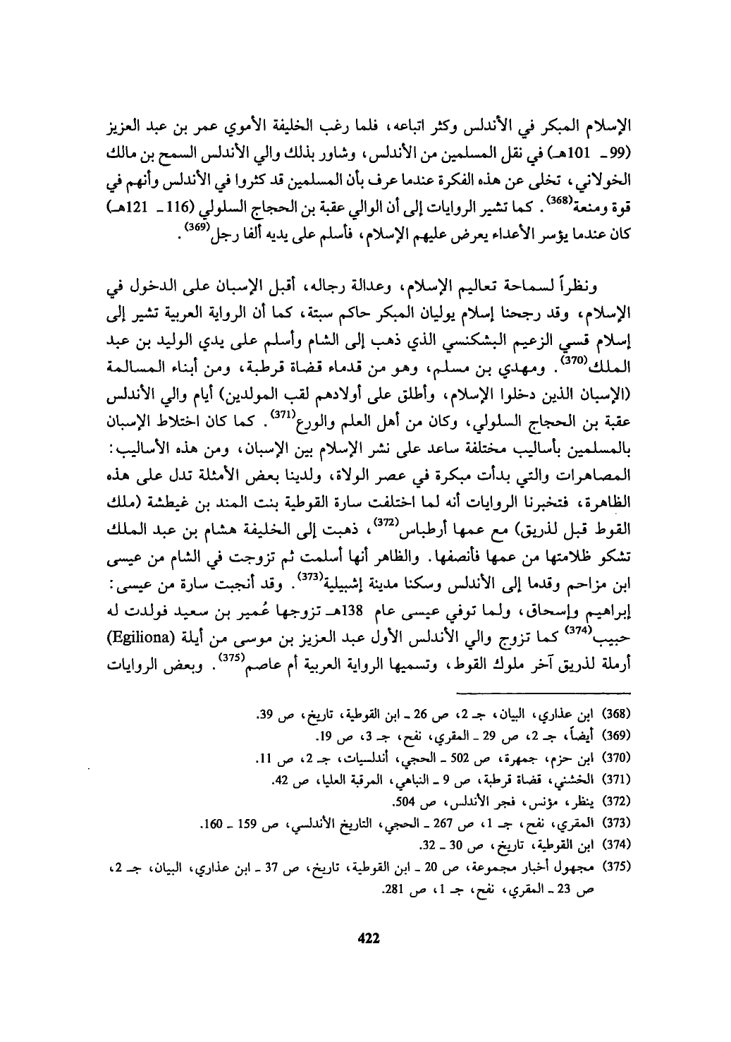ونظراً لسماحة تعاليم الإسلام، وعدالة رجاله، أقبل الإسبان على الدخول في الإسلام، وقد رجحنا إسلام يوليان المبكر حاكم سبتة، كما أن الرواية العربية تشير إلى إسلام قسي الزعيم البشكنسي الذي ذهب إلى الشام وأسلم على يدي الوليد بن عبد الملك (¬370). ومهدي بن مسلم، وهو من قدماء قضاة قرطبة، ومن أبناء المسالمة (الإسبان الذين دخلوا الإسلام، وأطلق على أولادهم لقب المولدين) أيام والي الأندلس عقبة بن الحجاج السلولي، وكان من أهل العلم والورع (¬371). كما كان اختلاط الإسبان بالمسلمين بأساليب مختلفة ساعد على نشر الإسلام بين الإسبان، ومن هذه الأساليب: المصاهرات والتي بدأت مبكرة في عصر الولاة، ولدينا بعض الأمثلة تدل على هذه الظاهرة، فتخبرنا الروايات أنه لما اختلفت سارة القوطية بنت المند بن غيطشة (ملك القوط قبل لذريق) مع عمها أرطباس (¬372)، ذهبت إلى الخليفة هشام بن عبد الملك تشكو ظلامتها من عمها فأنصفها. والظاهر أنها أسلمت ثم تزوجت في الشام من عيسى ابن مزاحم وقدما إلى الأندلس وسكنا مدينة إشبيلية (¬373). وقد أنجبت سارة من عيسى: إبراهيم وإسحاق، ولما توفي عيسى عام 138 هـ تزوجها عُمير بن سعيد فولدت له حبيب (¬374) كما تزوج والي الأندلس الأول عبد العزيز بن موسى من أيلة ( Egiliona) أرملة لذريق آخر ملوك القوط، وتسميها الرواية العربية أم عاصم (¬375). وبعض الروايات