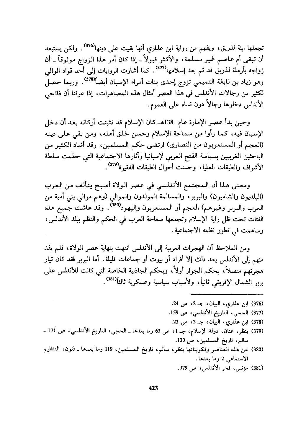 ومعنى هذا أن المجتمع الأندلسي في عصر الولاة أصبح يتألف من العرب (البلديون والشاميون) والبربر، والمسالمة المولدون والموالي (وهم موالي بني أمية من العرب والبربر وغيرهم) العجم أو المستعربون واليهود (¬380). وقد عاشت جميع هذه الفئات تحت ظل راية الإسلام وتجمعها سماحة العرب في الحكم والنظم ببلد الأندلس، وساهمت في تطور نظمه الاجتماعية.