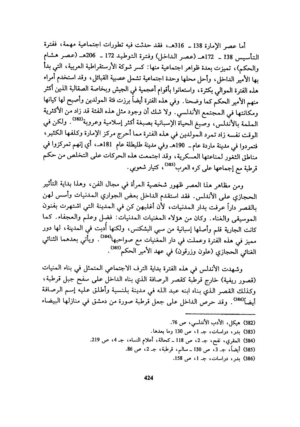 أما عصر الإمارة 138 - 316 هـ، فقد حدثت فيه تطورات اجتماعية مهمة، ففترة التأسيس 138 - 172 هـ (عصر الداخل) وفترة التوطيد 172 - 206 هـ (عصر هشام والحكم)، تميزت بعدة ظواهر اجتماعية منها: كسر شوكة الأرستقراطية العربية، التي بدأ بها الأمير الداخل، وأحل محلها وحدة اجتماعية تشمل عصبية القبائل، وقد استخدم أمراء هذه الفترة الموالي بكثرة، واستعانوا بأقوام أعجمية في الجيش وبخاصة الصقالبة الذين أكثر منهم الأمير الحكم كما وضحنا. وفي هذه الفترة أيضاً برزت فئة المولدين وأصبح لها كيانها ومكانتها في المجتمع الأندلسي. ولا شك أن وجود مثل هذه الفئة قد زاد من الأكثرية الملمة بالأندلس، وصبغ الحياة الإسبانية بصبغة أكثر إسلامية وعروبة (¬382). ولكن في الوقت نفسه زاد تمرد المولدين في هذه الفترة مما أحرج مركز الإمارة وكلفها الكثير، فتمردوا في مدينة ماردة عام - 190 هـ وفي مدينة طليطلة عام 181 هـ، أي إنهم تمركزوا في مناطق الثغور لمناعتها العسكرية، وقد اجتمعت هذه الحركات على التخلص من حكم قرطبة مع إجماعها على كره العرب (¬383)، كتيار شعوبي.