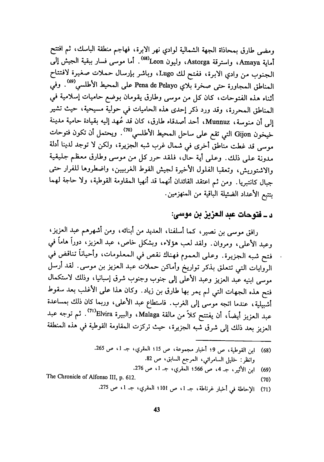 ومضى طارق بمحاذاة الجهة الشمالية لوادي نهر الابرة، فهاجم منطقة الباسك، ثم افتتح أماية Amaya، واسترقة Astorga، وليون Leon (¬68) . أما موسى فسار ببقية الجيش إلى الجنوب من وادي الابرة، ففتح لك Lugo، وباشر بإرسال حملات صغيرة لافتتاح المناطق المجاورة حتى صخرة بلاي Pena de Pelayo على المحيط الأطلسي (¬69). وفي أثناء هذه الفتوحات، كان كل من موسى وطارق يقومان بوضع حاميات إسلامية في المناطق المحررة، وقد ورد ذكر إحدى هذه الحاميات في حولية مسيحية، حيث تشير إلى أن منوسة، Munnuz، أحد أصدقاء طارق، كان قد عُهد إليه بقيادة حامية مدينة خيخون Gijon التي تقع على ساحل المحيط الأطلسي (¬70). ويحتمل أن تكون فتوحات موسى قد غطت مناطق أخرى في شمال غرب شبه الجزيرة، ولكن لا توجد لدينا أدلة مدونة على ذلك. وعلى أية حال، فلقد حرر كل من موسى وطارق معظم جليقية والاشتوريش، وتعقبا الفلول الأخيرة لجيش القوط الغربيين، واضطروها للفرار حتى جبال كانتبريا. ومن ثم اعتقد القائدان أنهما قد أنهيا المقاومة القوطية، ولا حاجة لهما بتتبع الأعداد الضئيلة الباقية من المنهزمين.