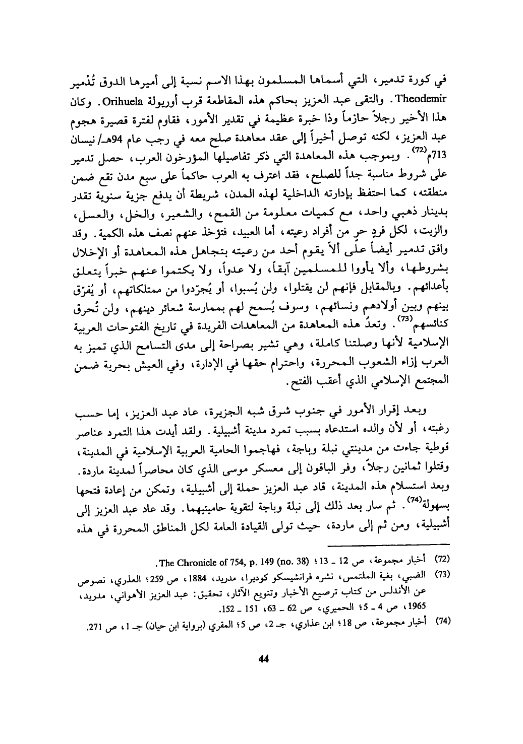 في كورة تدمير، التي أسماها المسلمون بهذا الاسم نسبة إلى أميرها الدوق تُدْمير Theodemir. والتقى عبد العزيز بحاكم هذه المقاطعة قرب أوريولة Orihuela. وكان هذا الأخير رجلاً حازماً وذا خبرة عظيمة في تقدير الأمور، فقاوم لفترة قصيرة هجوم عبد العزيز، لكنه توصل أخيراً إلى عقد معاهدة صلح معه في رجب عام 94 هـ/ نيسان 713 م (¬72). وبموجب هذه المعاهدة التي ذكر تفاصيلها المؤرخون العرب، حصل تدمير على شروط مناسبة جداً للصلح، فقد اعترف به العرب حاكماً على سبع مدن تقع ضمن منطقته، كما احتفظ بإدارته الداخلية لهذه المدن، شريطة أن يدفع جزية سنوية تقدر بدينار ذهبي واحد، مع كميات معلومة من القمح، والشعير، والخل، والعسل، والزيت، لكل فردٍ حرٍ مع أفراد رعيته، أما العبيد، فتؤخذ عنهم نصف هذه الكمية. وقد وافق تدمير أيضاً على ألاّ يقوم أحد من رعيته بتجاهل هذه المعاهدة أو الإخلال بشروطها، وألاّ يأووا للمسلمين آبقاً، ولا عدواً، ولا يكتموا عنهم خبراً يتعلق بأعدائهم. وبالمقابل فإنهم لن يقتلوا، ولن يُسبوا، أو يُجرّدوا من ممتلكاتهم، أو يُفرّق بينهم وبين أولادهم ونسائهم، وسوف يُسمح لهم بممارسة شعائر دينهم، ولن تُحرق كنائسهم (¬73). وتعدُ هذه المعاهدة من المعاهدات الفريدة في تاريخ الفتوحات العربية الإسلامية لأنها وصلتنا كاملة، وهي تشير بصراحة إلى مدى التسامح الذي تميز به العرب إزاء الشعوب المحررة، واحترام حقها في الإدارة، وفي العيش بحرية ضمن المجتمع الإسلامي الذي أعقب الفتح.