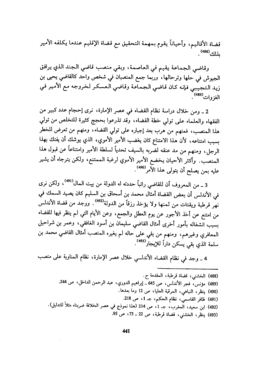 2 - ومن خلال دراسة نظام القضاء في عصر الإمارة، نرى إحجام عدد كبير من الفقهاء والعلماء على تولي خطة القضاء، وقد تذرعوا بحجج كثيرة للتخلص من تولي هذا المنصب، فمنهم من هرب بعد إجباره على تولي القضاء، ومنهم من تعرض للخطر بسبب امتناعه، لأن هذا الامتناع كان يغضب الأمير الأموي، الذي يوشك أن يفتك بهذا الرجل، ومنهم من مد عنقه لضربه بالسيف تحدياً لسلطة الأمير وامتناعاً عن قبول هذا المنصب. وأكثر الأحيان يخضع الأمير الأموي لرغبة الممتنع، ولكن يترجاه أن يشير عليه بمن يصلح أن يتولى هذا الأمر (¬490).